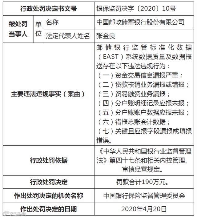 邮储银行监管标准化数据(EAST)系统数据质量及数据报送存在以下违法违规行为: