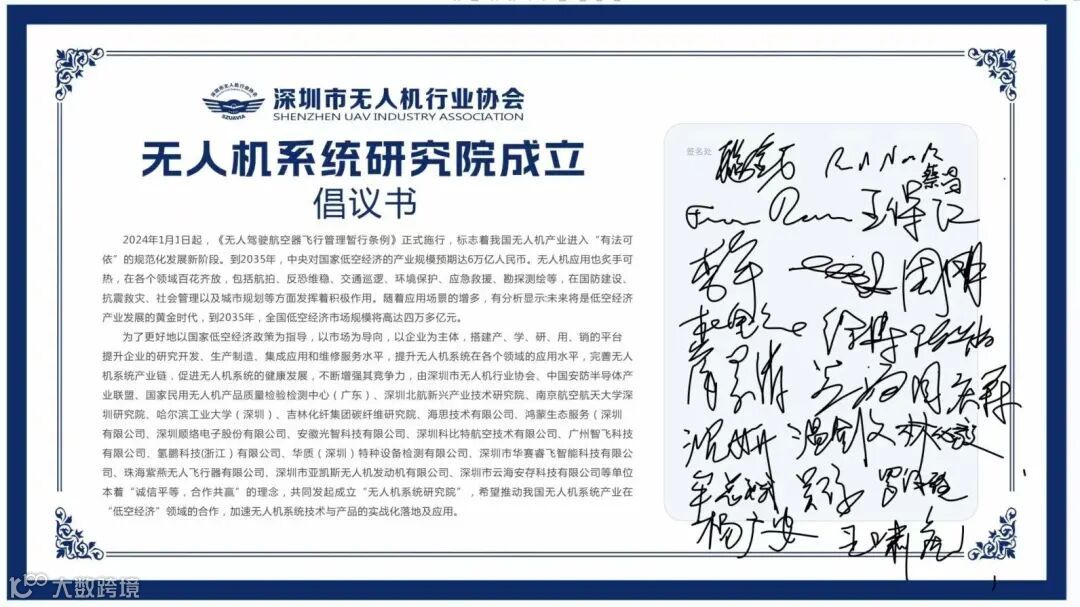 为了更好地以国家低空经济政策为指导,以市场为导向,以企业为主体,搭建产、学、研、用、销的平台,提升企业的研究开发、生产制造、集成应用和维修服务水平,提升无人机系统在各个领域的应用水平,完善无人机系统产业链,促进无人机系统的健康发展,不断增强其竞争力,由中国安防半导体产业联盟、国家民用无人机产品质量检验检测中心(广东)、深圳市无人机行业协会、深圳北航新兴产业技术研究院、南京航空航天大学深圳研究院、哈尔滨工业大学(深圳)、吉林化纤集团碳纤维研究院、海思技术有限公司、鸿蒙生态服务(深圳)有限公司、深圳顺络电子股份有限公司、安徽光智科技有限公司、深圳科比特航空技术有限公司、广州智飞科技有限公司、氢鹏科技(浙江)有限公司、华质(深圳)特种设备检测有限公司、深圳市华赛睿飞智能科技有限公司、珠海紫燕无人飞行器有限公司、深圳市亚凯斯无人机发动机有限公司、深圳市云海安存科技有限公司等单位共同发起的深圳市无人机行业协会无人机系统研究院于3月1日在深圳成立。