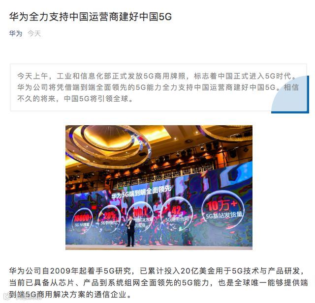 刚刚,华为官微发文称,全力支持中国运营商建好中国5G!