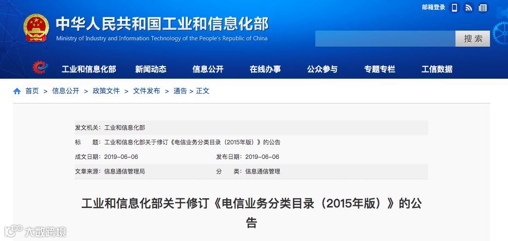 工信部官网今日发公告称,为贯彻落实中央经济工作会议精神,加快5G商用步伐,依据《中华人民共和国电信条例》,工业和信息化部对《电信业务分类目录(2015年版)》(以下简称《目录》)进行了修订。