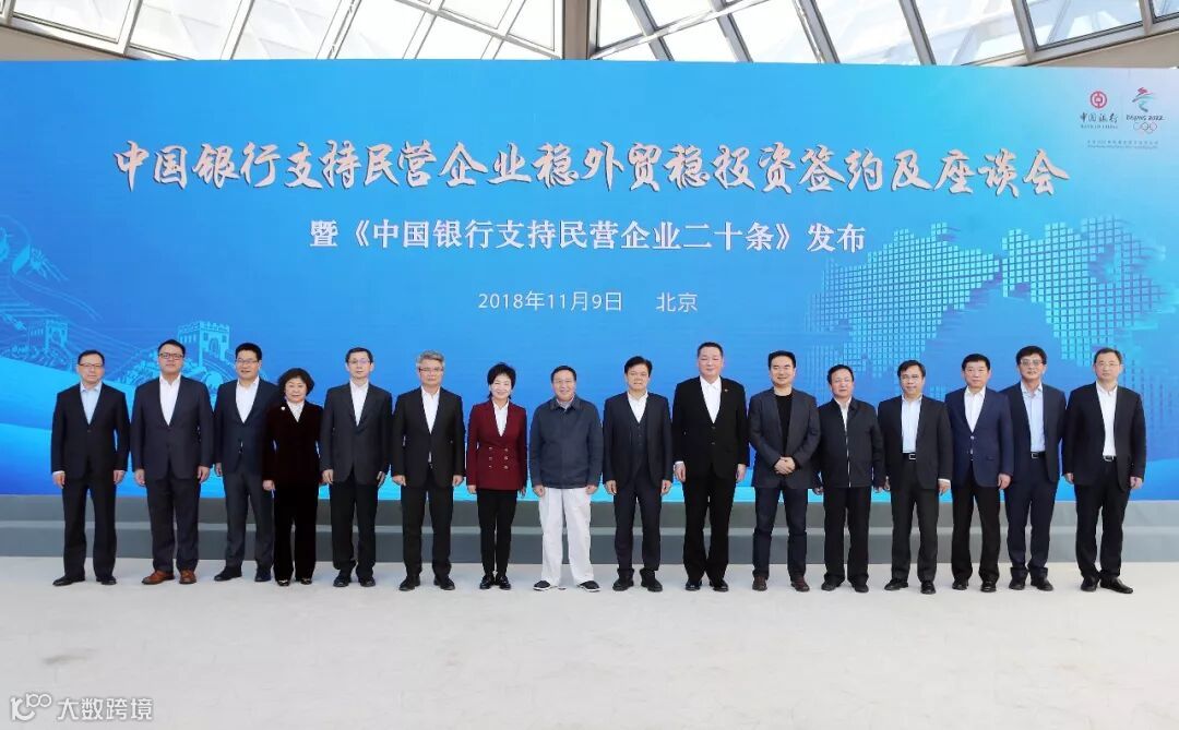 11月9日,中国银行发布《支持民营企业二十条》,并在总行主会场及9个分会场与超百家民营企业签署《总对总合作协议》,随后召开支持民营企业稳外贸稳投资座谈会。商务部、中国人民银行、全国工商联相关领导,中国银行董事长陈四清、行长刘连舸、副行长林景臻、首席风险官潘岳汉等出席。