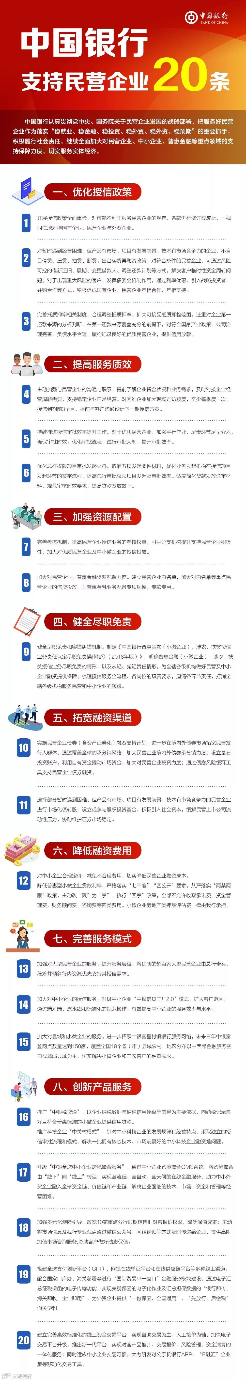 《支持民营企业二十条》是中国银行切实履行社会责任,毫不动摇支持民营企业发展所做出的庄重承诺。前期,中国银行开展了“1120”工程,即对1000家企业开展问卷调查、对100家企业持续跟进、对20家企业面对面访谈。在广泛征求民营企业意见建议基础上,中国银行制定了涵盖“优化授信政策、提高服务质效、加强资源配置、健全尽职免责、拓宽融资渠道、降低融资费用、完善服务模式和创新产品服务”等八个方面的二十条针对性支持措施,切实解决民营企业在发展过程中遇到的痛点和难点问题。