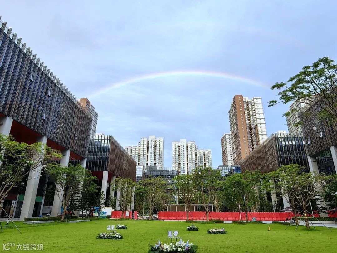 作品寓意:梦工场北区的中央草坪,在晴好的天光里格外亮眼。脚下是修剪得蓬松柔软的翠绿草坪,几簇点缀着鲜花的装饰小景错落其间,衬得绿意更显鲜活;周围是线条利落的现代办公楼,深色幕墙与浅白立柱的搭配自带都市质感,远处的高层住宅群则添了几分生活烟火气。而澄澈蓝天里那道完整舒展的彩虹,像给这片空间裹了层温柔滤镜 —— 原本规整的办公区域,在自然光影与清新景致的交融里,少了几分严肃,多了都市里难得的松弛与明媚。