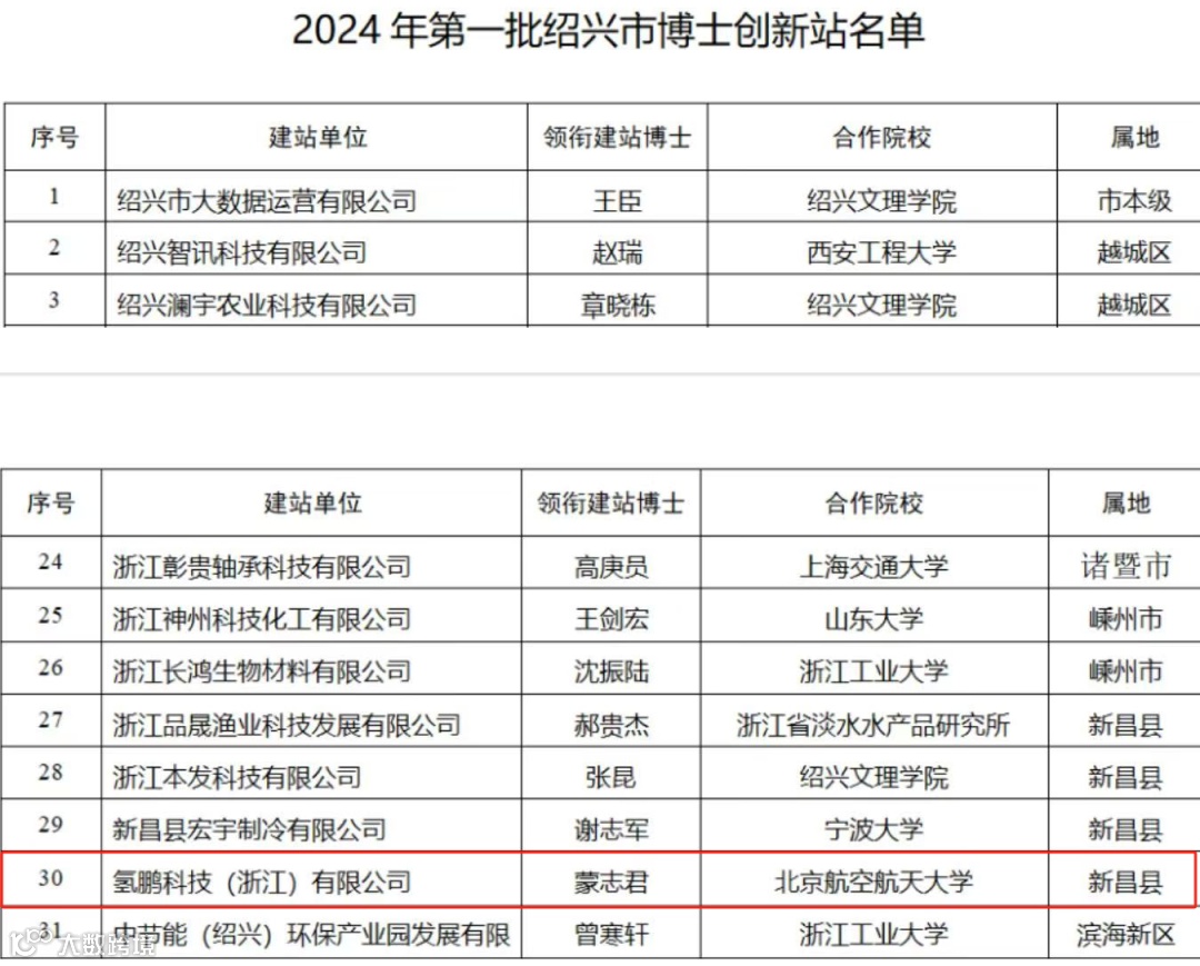 根据《中共绍兴市委办公室 绍兴市人民政府办公室 印发修订后的<关于加快建设新时代 “名士之乡”人才高地的若干政策> 等3个政策文件的通知》(绍市委人领〔2024〕2号)、《绍兴市博士创新站建设与管理办法》(绍市科协〔2023〕23号)等文件要求,氢鹏科技(浙江)有限公司经过前期申报、推荐和评审,成功获批绍兴市博士创新站。