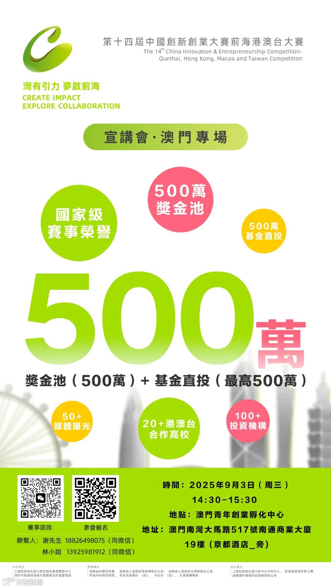 为更好帮助参赛企业全面了解大赛规则与流程、精准把握大赛扶持措施,大赛组委会将于9月3日联合澳门青年创业孵化中心开展大赛宣讲会(澳门专场),进行赛事介绍与现场面对面参赛辅导。