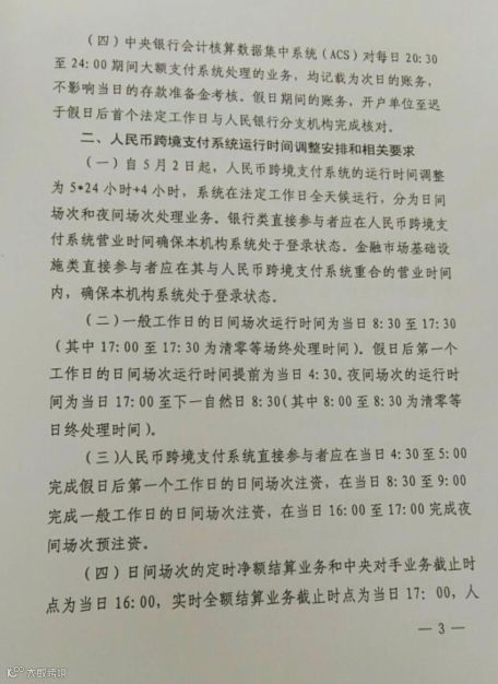 2、自5月5日起,大额支付系统在每个周末或法定节假日期间(以下统称假日)的首日运行,并执行特殊业务规则:业务受理时间为前一自然日20:30至当日8:30;业务受理范围为人民币跨境支付系统 参与者发起的注资及资金拆借业务,其他业务均不受理;小额支付系统和网上支付跨行清算系统的轧 差净额也不提交清算。