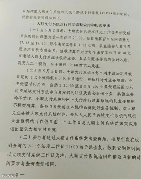1、自5月2日起,大额支付系统在法定工作日开始受理业务的时间调整为前一自然日20:30,每日清算窗口时间调整为17:15至17:30。每个法定工作日8:30之前,各直接参与者可自愿登录系统办理业务 ,接收清算行对于每个法定工作日8:30之前通过大额支付系统接收的业务,具备入账条件的应及时入账;需要人工干预的,应于当日12:00前完成处理。