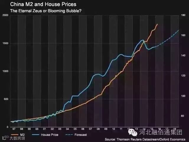 中国M2(黄线)与房价(蓝线)
