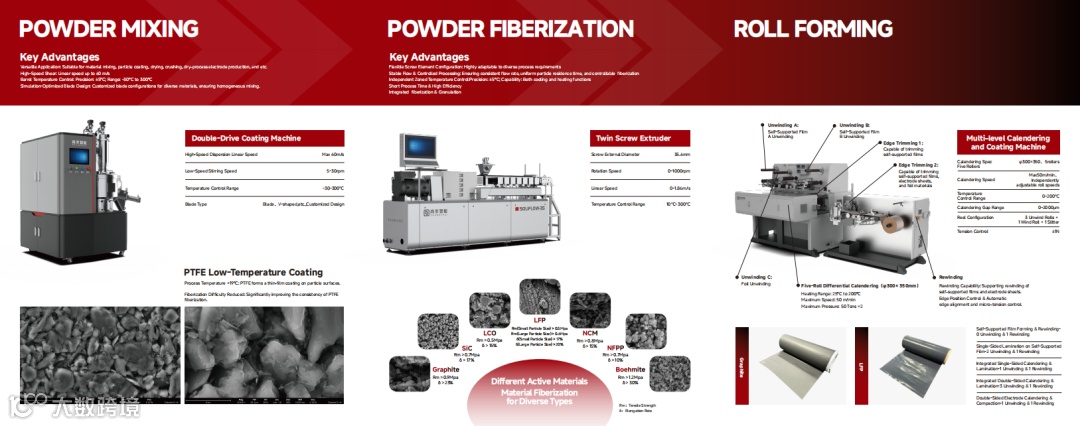 其中,广泛应用于物料混合、包覆、干燥、破碎及干法电极的双传动包覆机可针对不同物料仿真设计桨叶。尚水智能推出的双螺杆挤出机有效地解决了纤维化过程差异大、程度不均一等工艺难题;辊压覆膜一体机可实现多功能辊压等。