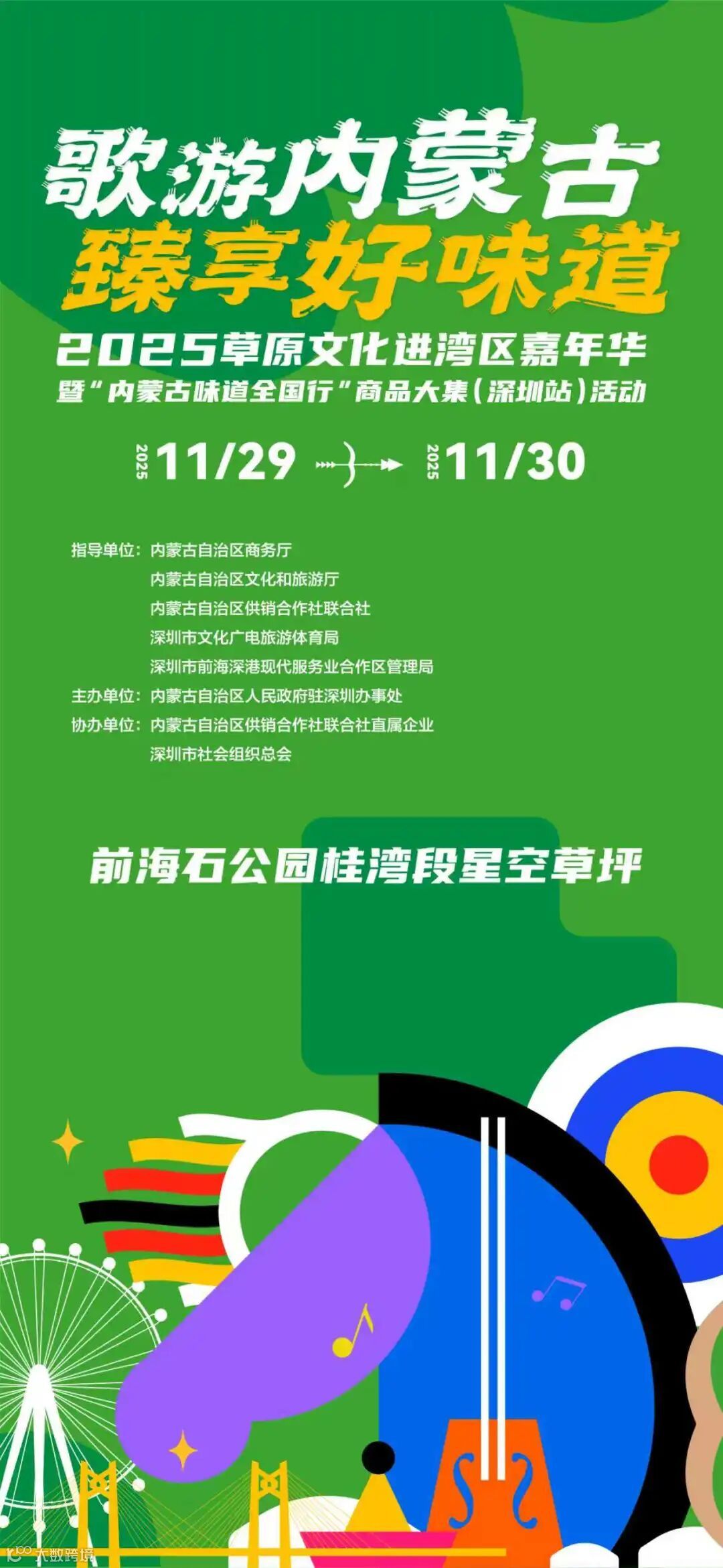 11月29日至30日,由内蒙古自治区人民政府驻深圳办事处主办,内蒙古自治区商务厅、内蒙古自治区文化和旅游厅、深圳市文化广电旅游体育局、前海深港现代服务业合作区管理局等共同指导的“歌游内蒙古 臻享好味道”——2025草原文化进湾区嘉年华暨“内蒙古味道全国行”商品大集将在前海石公园桂湾段星空草坪举行。