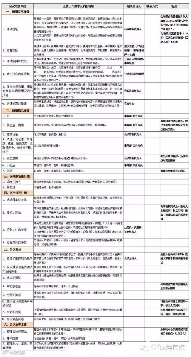 一个会议活动的成功举办离不开好的会议活动执行要求。以下将会议活动执行要求按照前期事项准备、前期物品准备、客户报到注册、会议现场、会议后期工作这几大类详细说明。