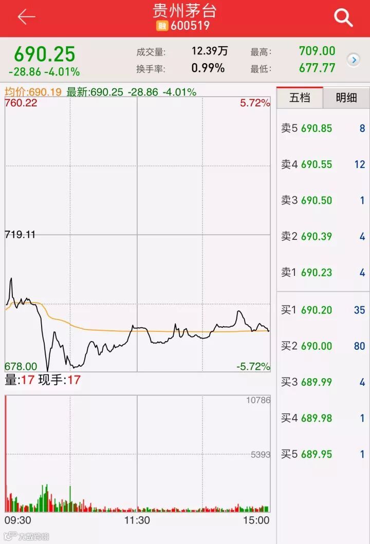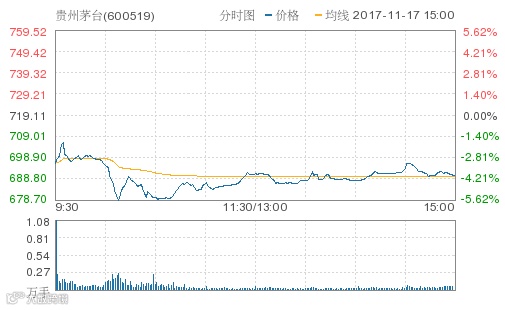 贵州茅台11月16日晚发布风险提示公告,公司称最近市场上的一些讨论和观点,尤其是关于公司过高的目标股价及估值均不代表公司的态度,希望广大投资者和消费者理性看待,审慎决策。近期公司股价上涨幅度较大,公司将继续做好生产经营各项工作,提请广大投资者注意投资风险,理性投资,不要盲目跟风。受此影响,周五(11月17日)早盘,贵州茅台在连续大涨之后遭遇“急刹车”,开盘即大跌超过3%,盘中跌幅一度接近6%。截至中午收盘,贵州茅台下跌3.91%,报691元/股,成交63.92亿元。整个上午,茅台市值蒸发354亿元。截至下午收盘,贵州茅台报690.25元/股,全天市值蒸发362亿元。