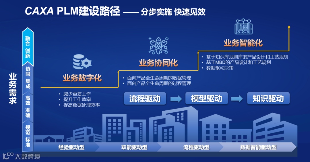 ——首先是通过数据规范、标准的集中管理,以流程驱动的方式实现业务数字化,减少重复工作,提升工作效率,提高数据处理效率;然后通过项目驱动/模型驱动以及系统集成,实现业务协同化,进行面向产品全生命周期的数据及过程管理;最后通过对数据的分析,知识智能推荐,以数据驱动决策,来实现业务智能化。