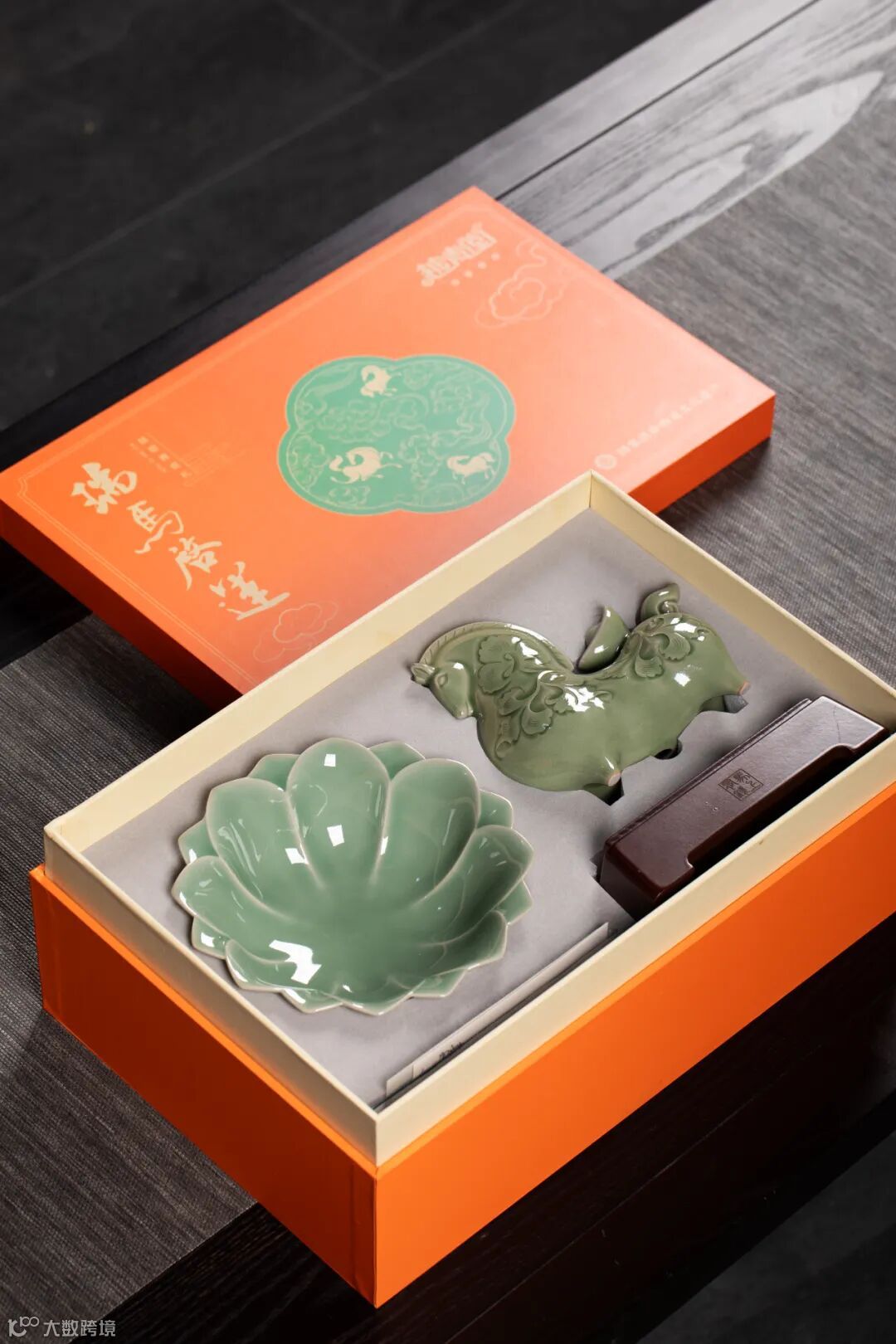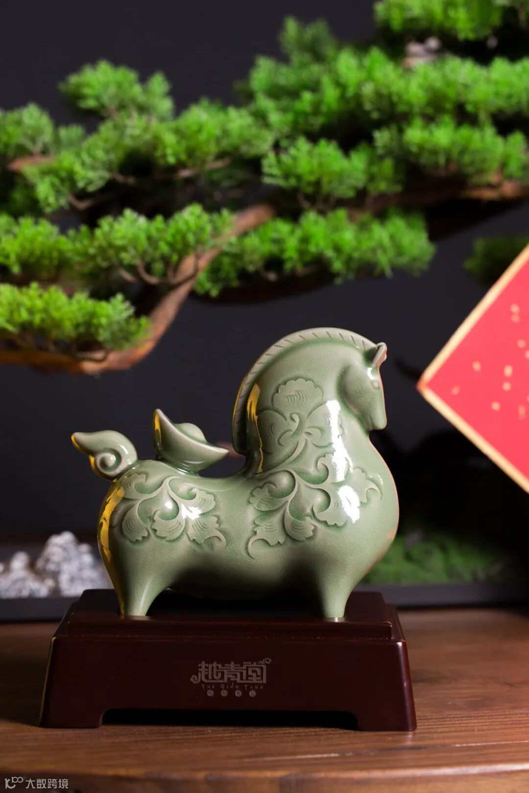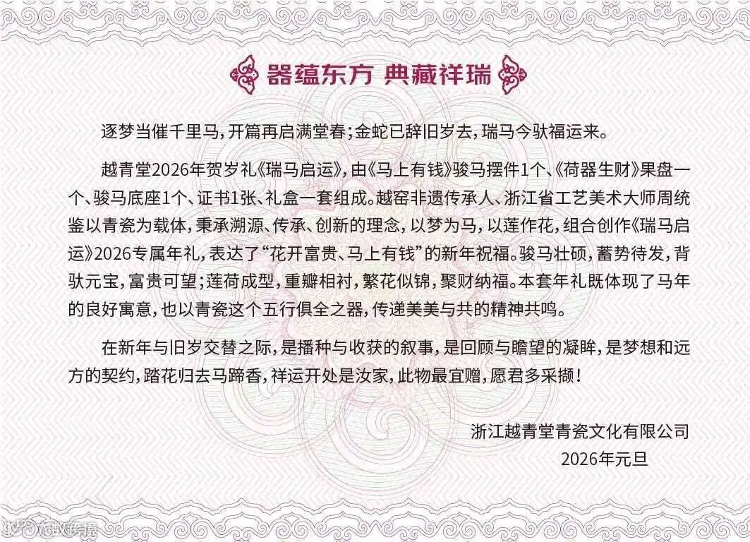 越窑非遗传承人周统鉴大师以越窑青瓷为载体,秉承溯源、传承、创新的理念,以梦为马,以莲作花,组合创作《瑞马启运》2026专属年礼,表达了“花开富贵、马上有钱”的新年祝福。骏马壮硕,蓄势待发,背驮元宝,富贵可望;莲荷成型,重瓣相衬,繁花似锦,聚财纳福。本套年礼既体现了马年的良好寓意,也以青瓷这个五行俱全之器,传递美美与共的精神共鸣。