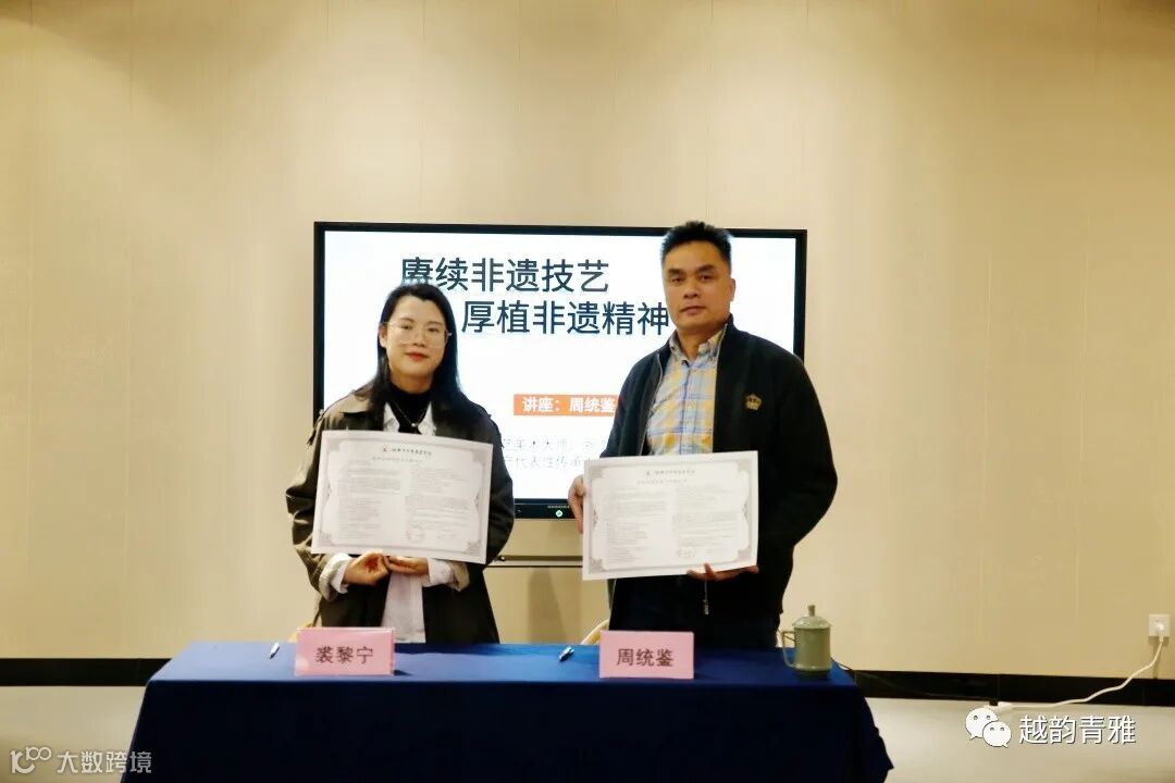 浙江省工艺美术大师周统鉴和裘黎宁老师进行“赓续非遗精神,技艺代代相传”非遗复合型创新创业人才协同共育协议签约仪式。