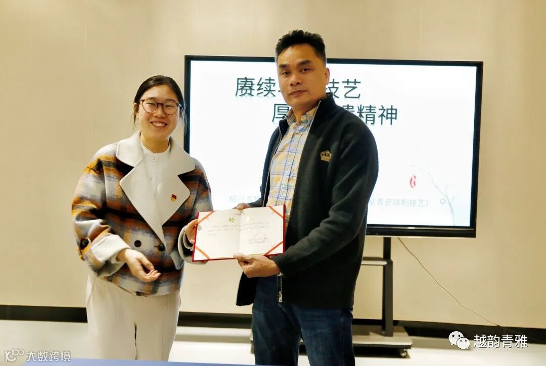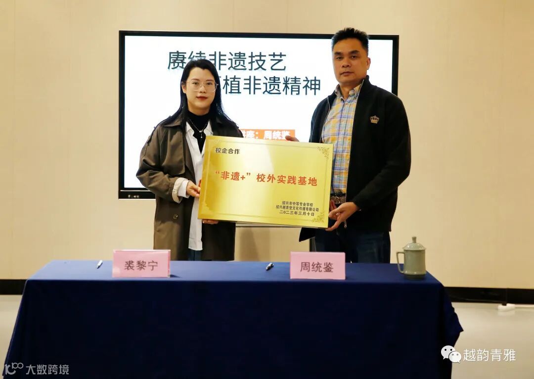 本着以上理念,3月10日,绍兴市中等专业学校在学校非遗项目负责人吴培芳、黄臻等老师的带领下,一行数十人来到上虞瓷源文化小镇浙江越青堂总部,正式开展了签约结对仪式,并以“越青堂非遗工坊作为学校的校外实践基地,越青堂在学校成立大师工作室”的形式,推进校企合作,专门培养优秀非遗人才。