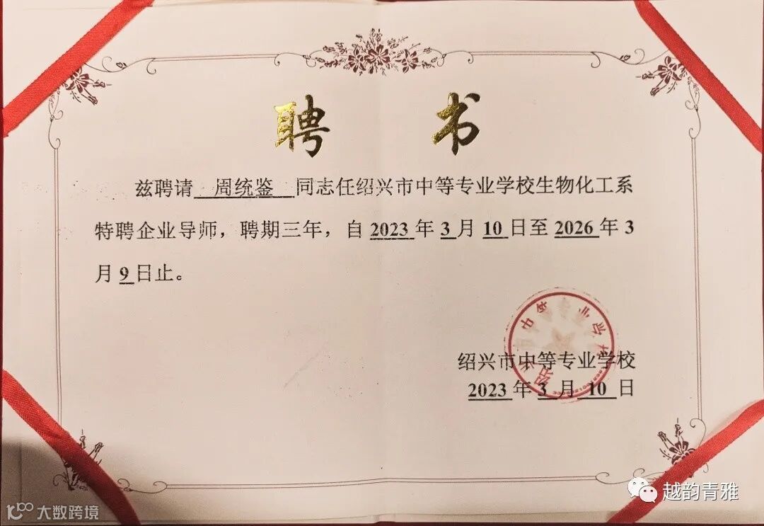 绍兴市中等专业学校生物化工系聘请越青堂董事长、浙江省工艺美术大师周统鉴为学校人才培养企业导师。