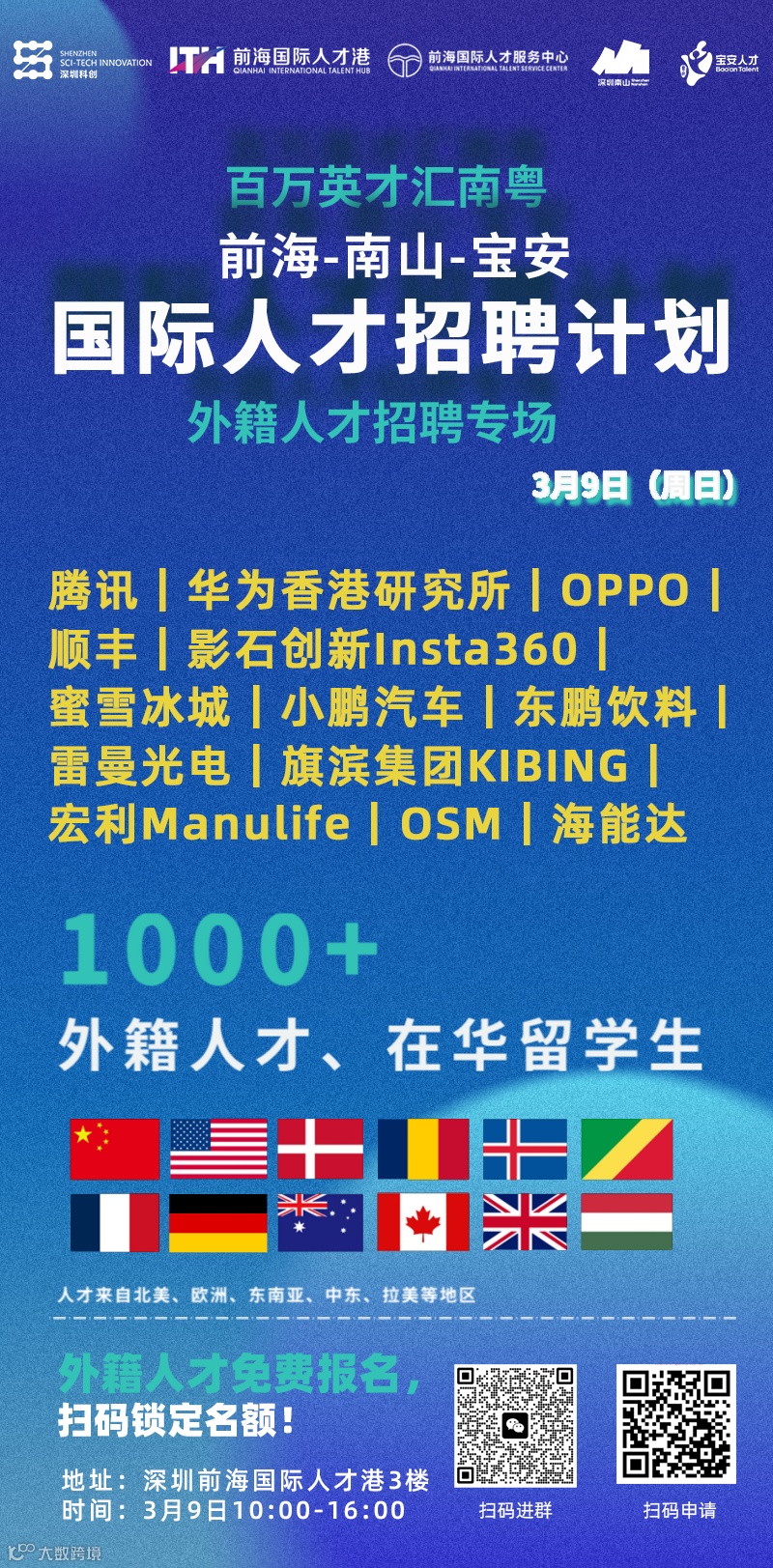 为积极贯彻“百万英才汇南粤行动计划”,前海携手南山、宝安重磅推出“国际人才招聘计划”,为国际人才与湾区名企搭建起一座“云上之桥”。该计划致力于为国际人才提供全方位、一站式求职服务,全球人才扎根湾区持续赋能。