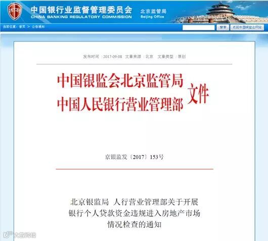 9月8日,中国银监会北京监管局和中国人民银行营业管理部联合印发了《北京市银监局人行营业管理部关于开展银行个人贷款资金违规进入房地产市场情况检查的通知》,要求北京市银行业金融机构对个人经营性贷款和个人消费贷款开展自查工作,重点检查“房抵贷”等资金违规流入房地产市场的情况。
