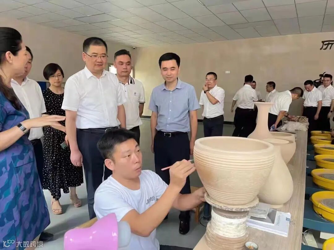 胡书记和金区长调研越窑制作技艺中的刻划花雕刻工艺。