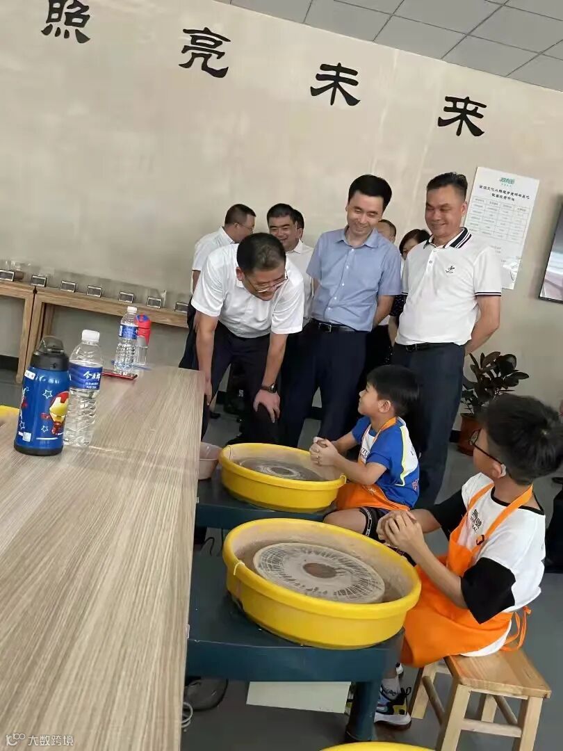 胡书记弯下腰亲切地询问参加瓷源研学的小朋友。