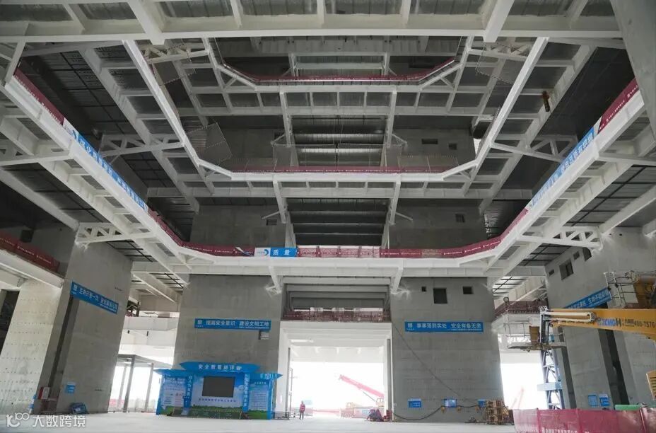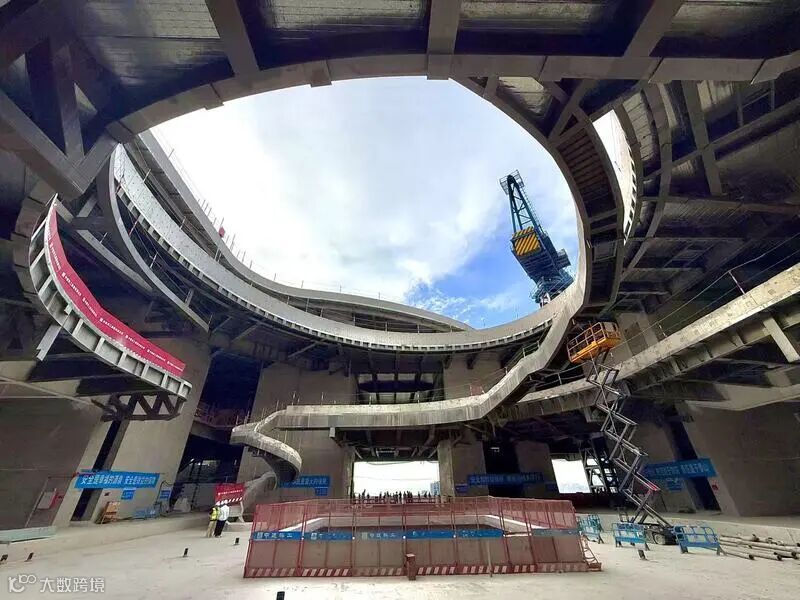在距离地面45米高的五层平台,近百米跨度的无柱山海剧场同样令人惊叹。项目团队创新性地将桥梁工程的拱结构应用于建筑高位,成功打造国内罕见的大跨度无柱空间。两座圆拱分别高达22.75米、跨度94.34米,南北各一。施工过程中,总包团队引入预应力智能张拉系统,实现了巨型圆拱的“毫米级合龙”。