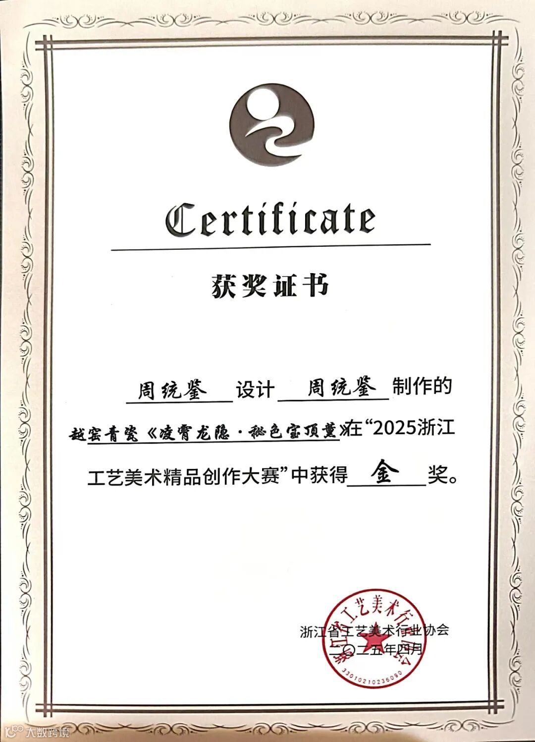 日前,浙江越青堂在第十三届中国(浙江)工艺美术精品博览会暨浙江省工艺美术创意设计展上,参展和参赛的9件作品中,共获得4项金奖、1项银奖的好成绩,其中,浙江省工艺美术大师周统鉴的《凌霄龙隐》秘色宝顶薰等两件作品获得金奖、绍兴市工艺美术艺术大师屠宗毅的《舜耕》赏瓶获得金奖、绍兴市工艺美术艺术大师罗洪良的《捩翠融青》赏瓶获得金奖,尤其值得骄傲的是,周统鉴大师传帮带的上虞青年学子、鲁迅美术学院工艺美术系陶艺专业在读学生郑恬设计、周统鉴制作的作品《梵韵笑莲如意薰》获得了金奖,周大师的徒弟、景德镇陶瓷大学专业毕业的马怡雯获得银奖!传承技艺、创新越窑、培养人才,越青堂一直在努力!