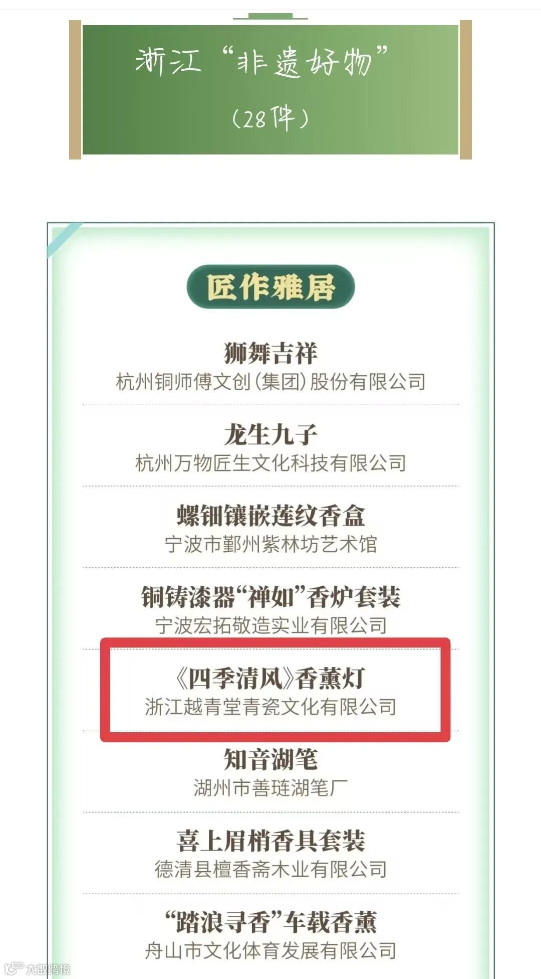 在近日举办的2025年“非遗焕新购物月”暨浙江省“茶和天下 共享非遗”活动中,浙江、江苏、安徽、江西、河南和新疆六省(自治区)发布“非遗好物”合计150件,其中,浙江“非遗好物”共28件,越青堂文创作品《四季清风》香薰灯成功入选,是全绍兴市唯一入选的“非遗好物”产品。非遗元素融入产品领域,既承载中式生活、中式美学的深厚文化内涵,也反映时尚审美和现代观念,体现了非遗创造性转化、创新性发展的最新成果!