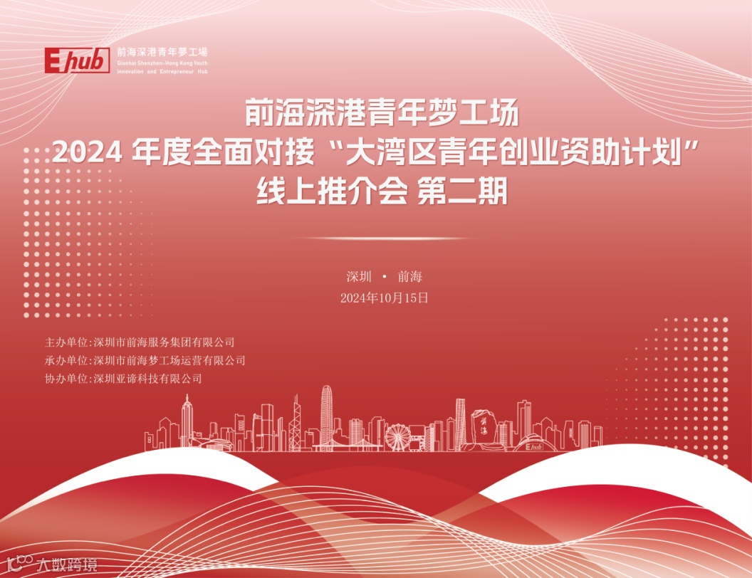 2024年10月15日,由深圳市前海服务集团有限公司主办,深圳市前海梦工场运营有限公司承办,深圳亚谛科技有限公司协办的前海深港青年梦工场2024年度全面对接“大湾区青年创业资助计划”第二期线上推介会在前海深港青年梦工场成功举办,活动共吸引了深港两地90位人员参与。