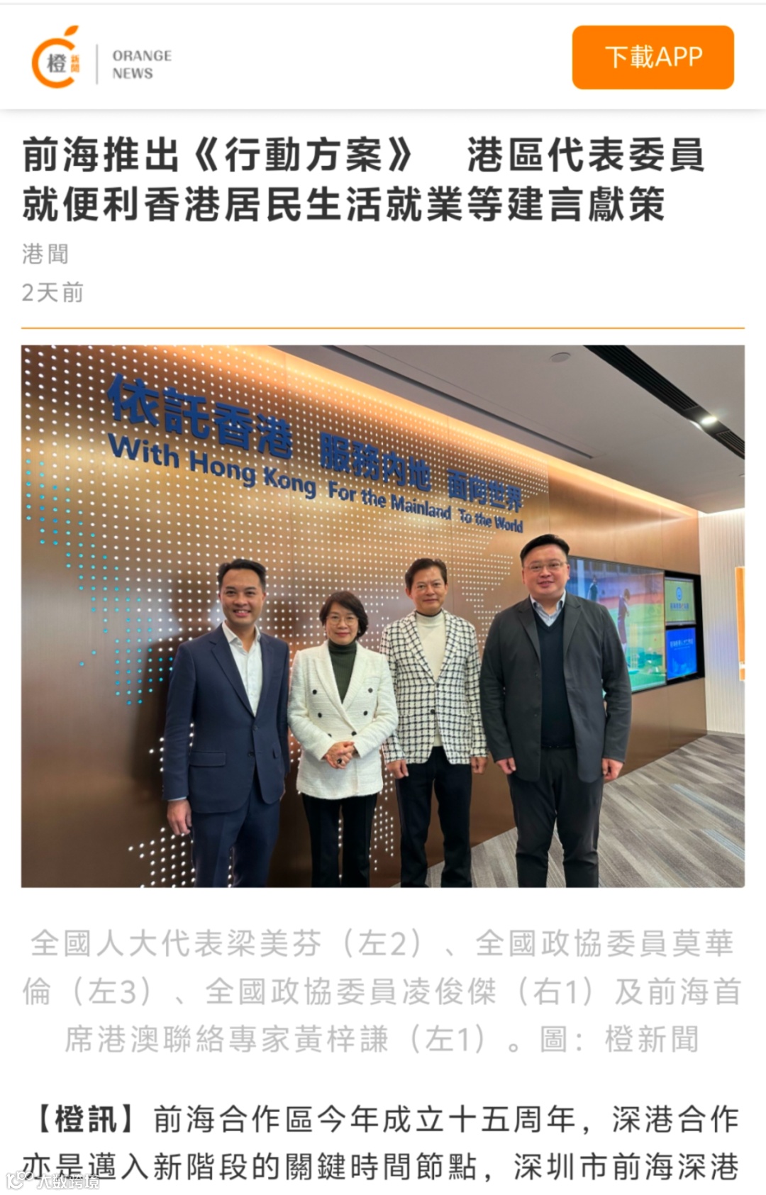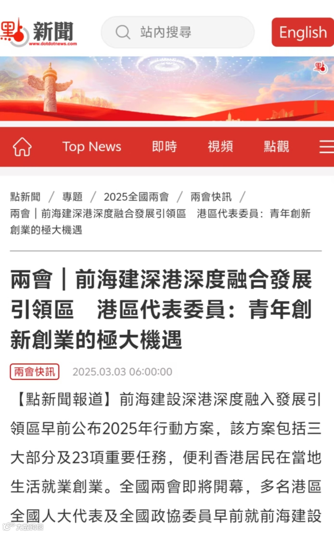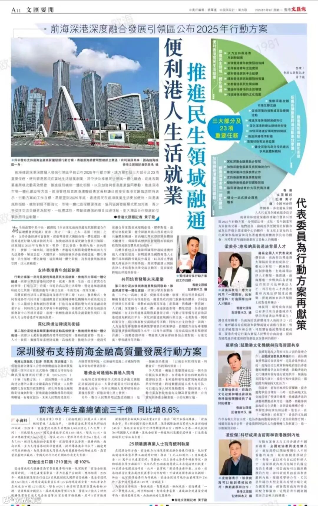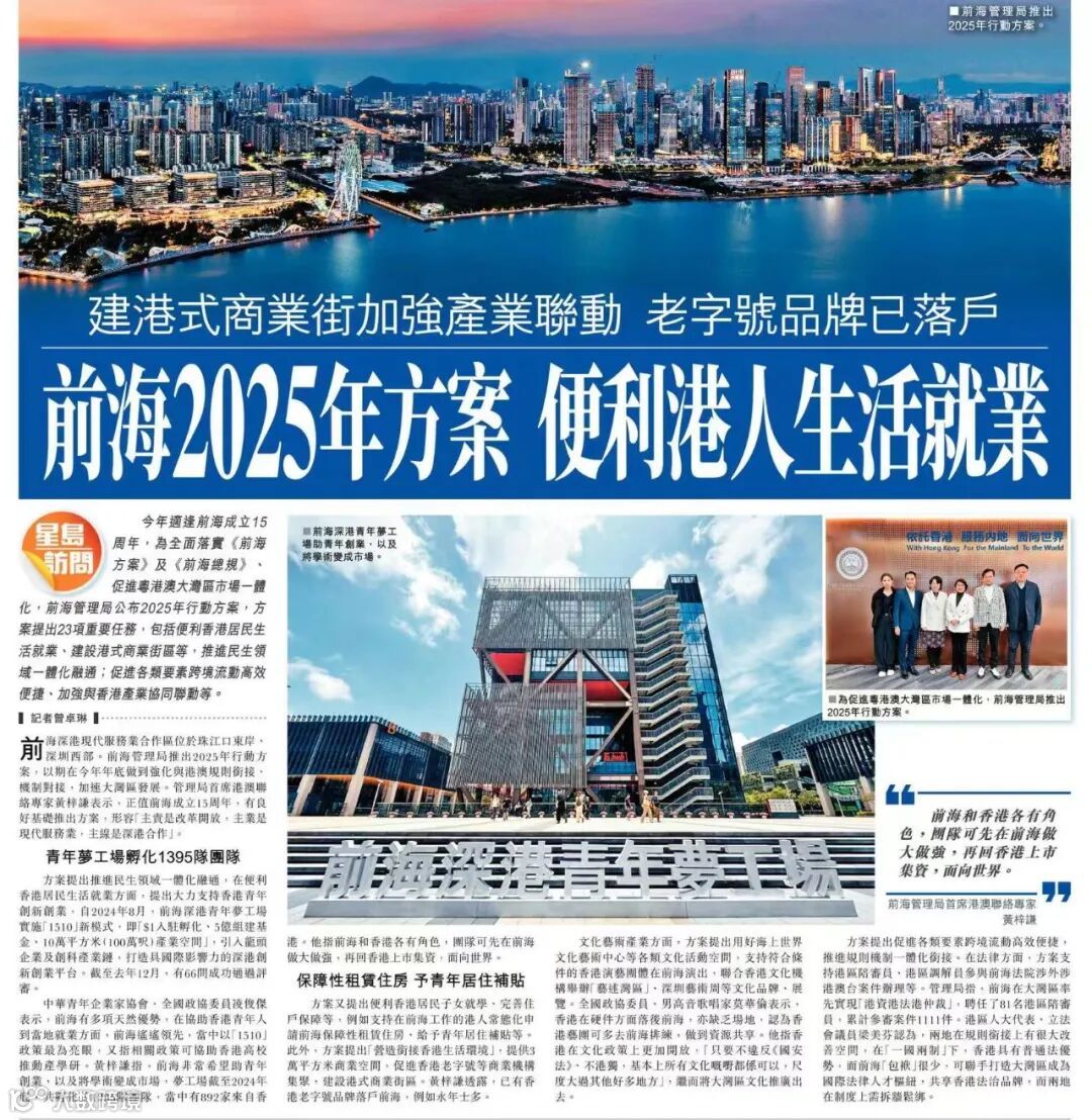 近日,前海重磅发布《前海建设深港深度融合发展引领区2025年行动方案》(以下简称《行动方案》) ,围绕“便利香港居民生活就业,推进民生领域一体化融通”“促进各类要素跨境流动高效便捷,推进规则机制一体化衔接”和“加强与香港产业协同联动,推进深港市场一体化建设”提出23项重点任务,加快建设深港深度融合发展引领区。香港媒体对此高度关注,认为《行动方案》提出的系列举措将便利港人生活,并为香港青年创业带来极大机遇。
