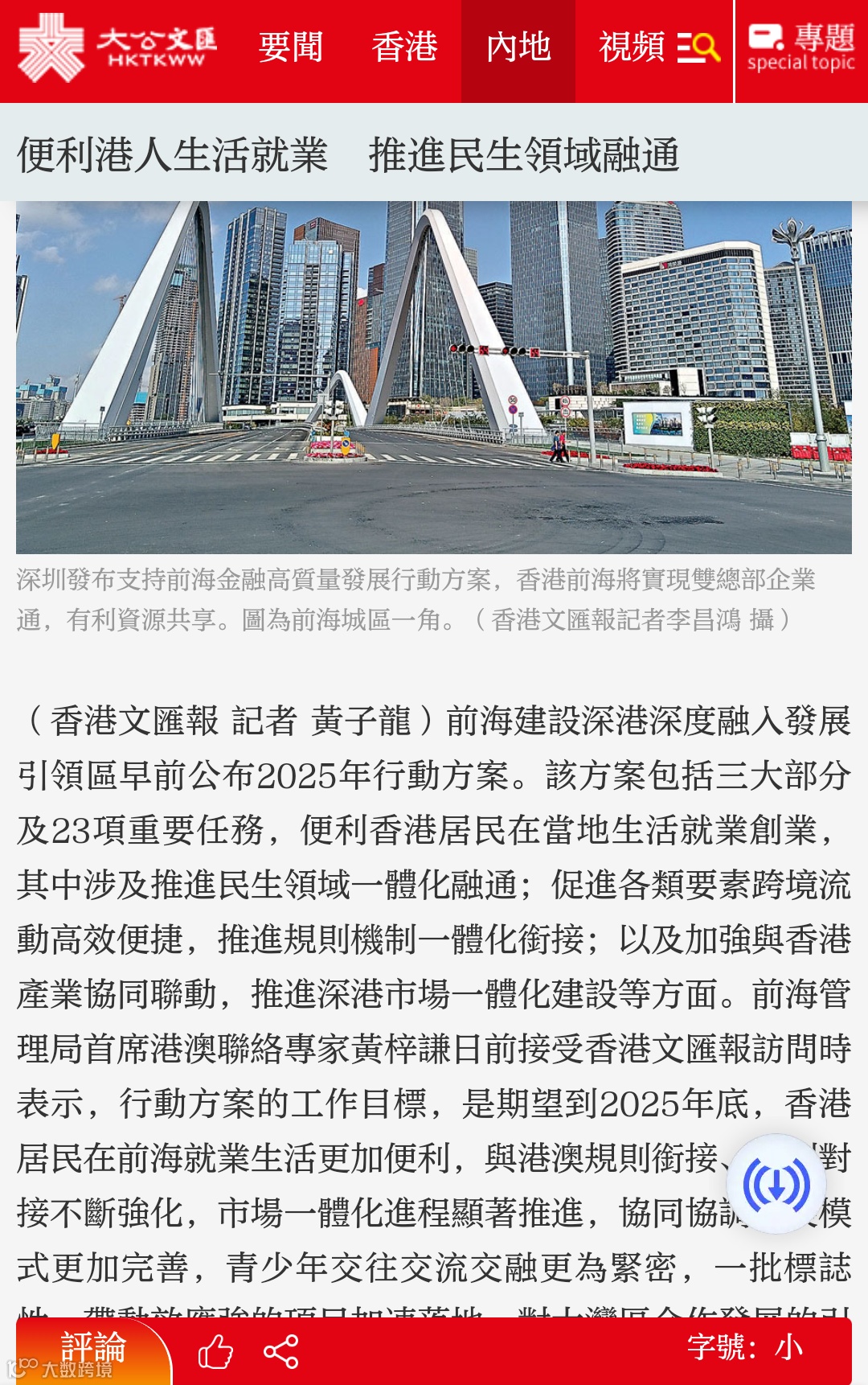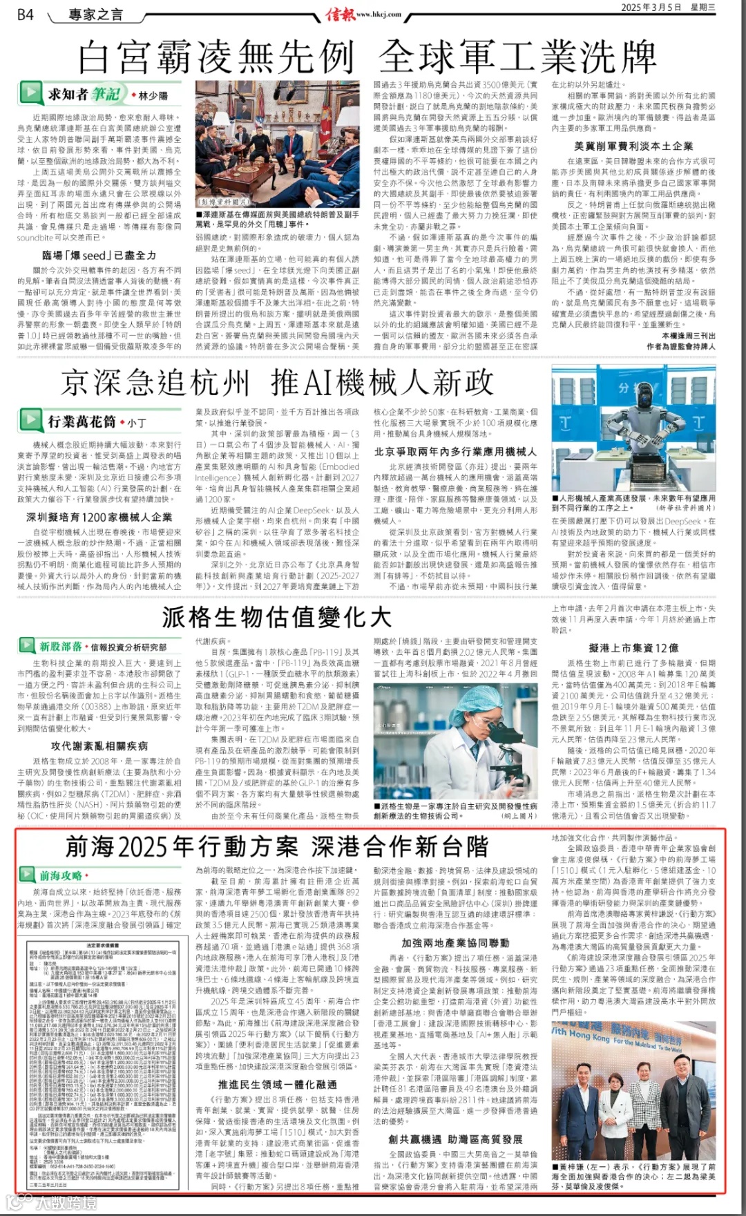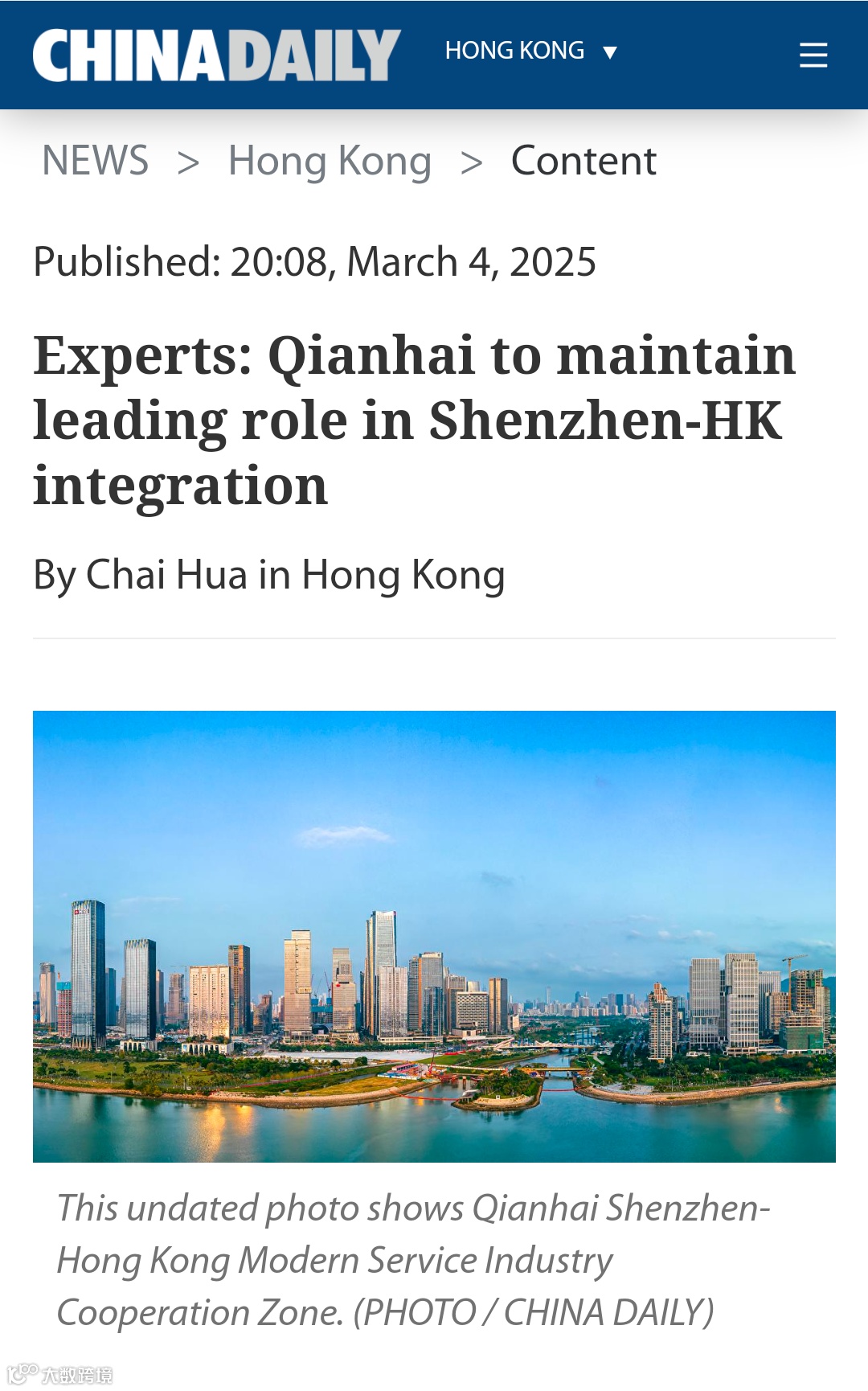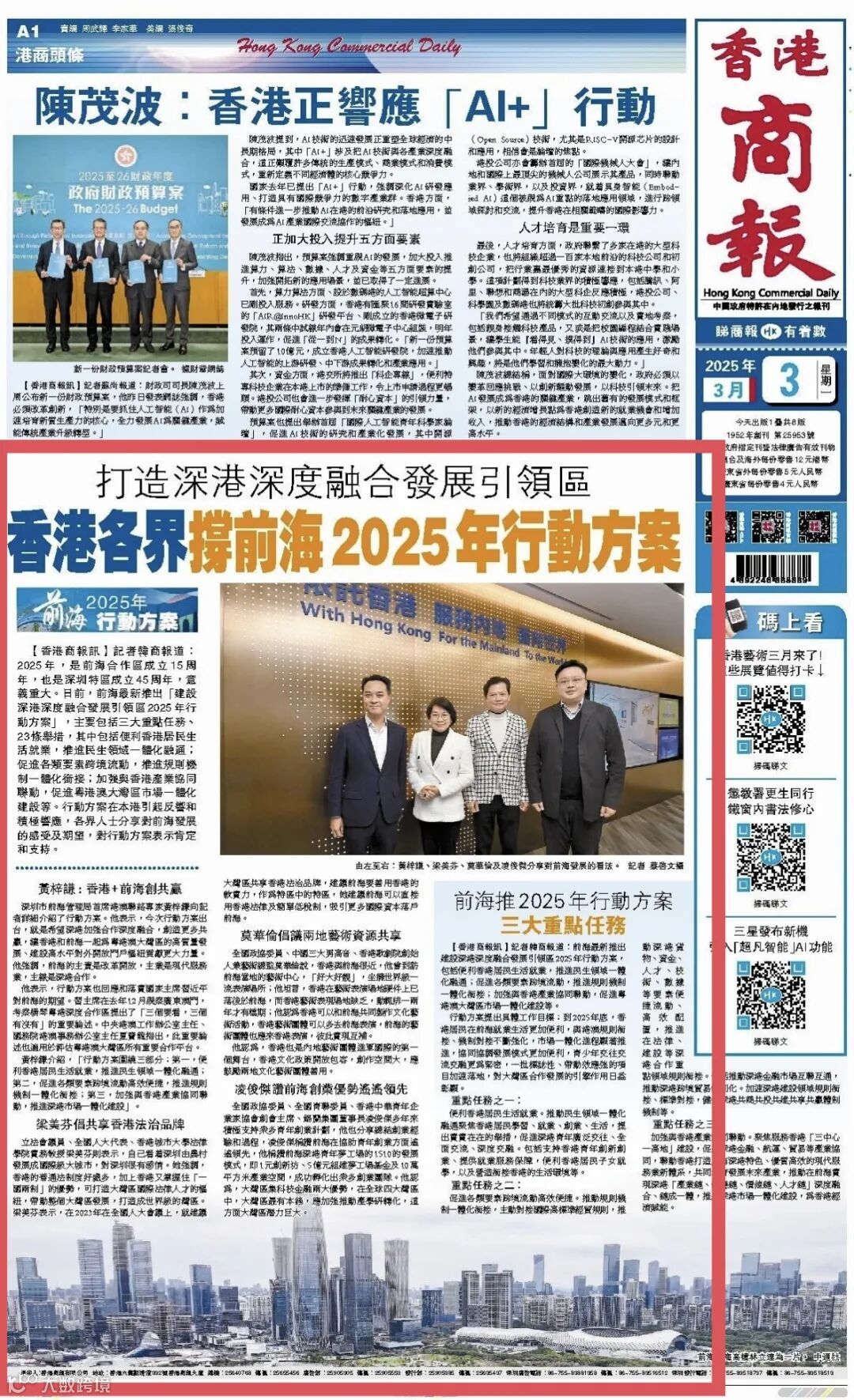 香港文汇报、大公文汇、信报、香港经济日报、CHINADAILY、紫荆杂志、点新闻、橙新闻等媒体报道《前海建设深港深度融合发展引领区2025年行动方案》发布。