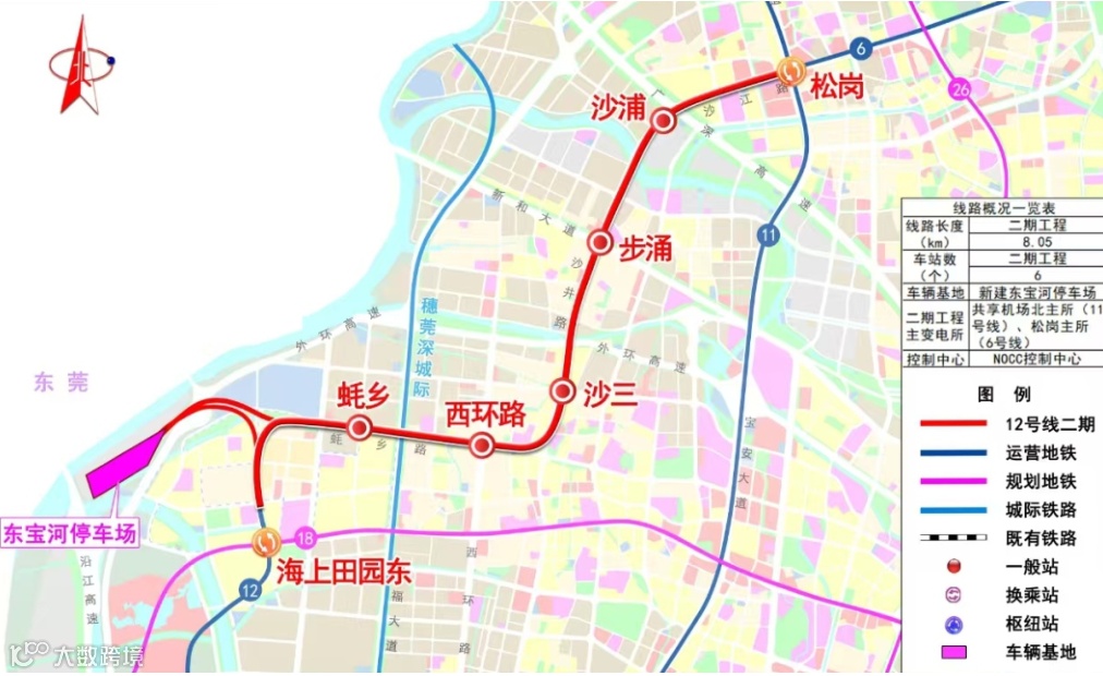 该线路始于海上田园东站,止于松岗站,全长约8.05公里,共设6站6区间,包括蚝乡站、沙蚝站、沙井古墟站、步涌站、朗下站和松岗站。