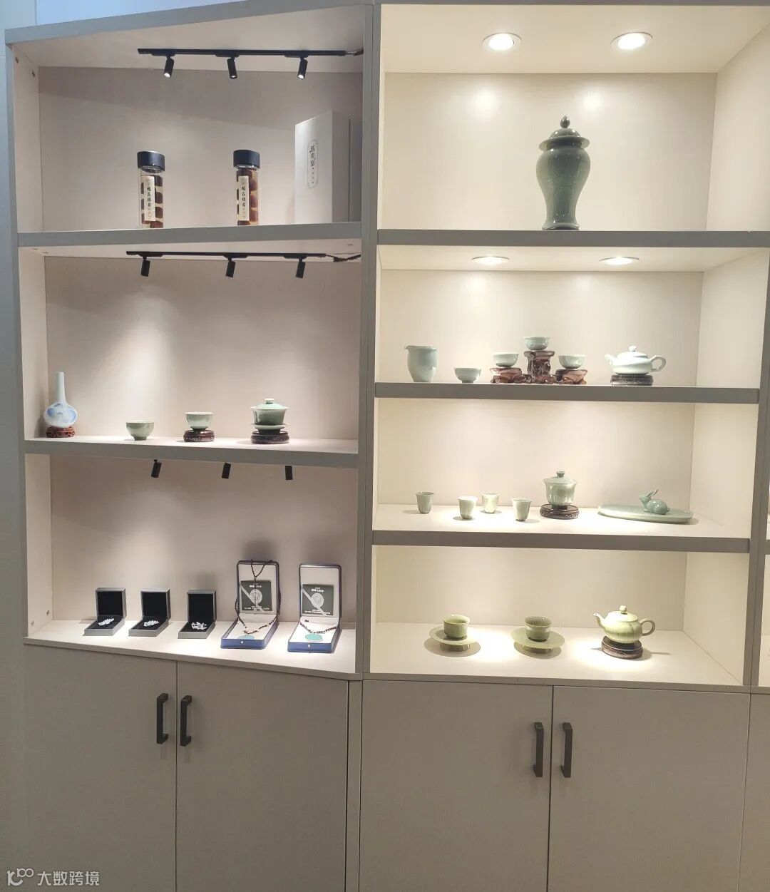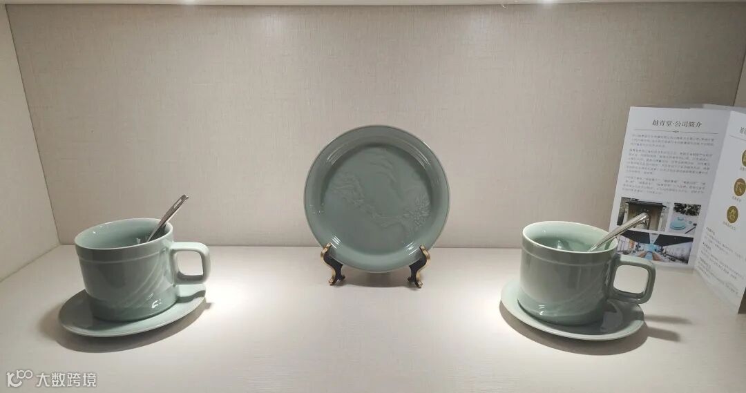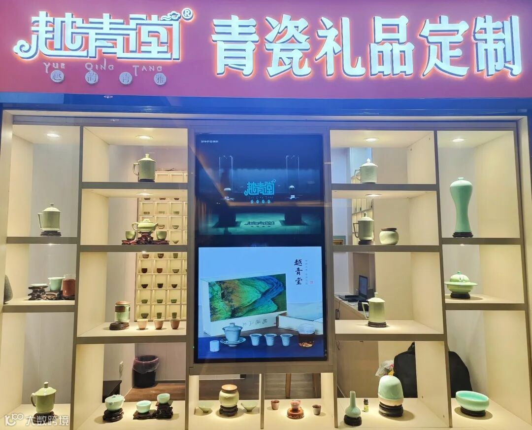店面位于咸亨酒店内部,一进门右转便能看到“越青堂青瓷礼品定制” 闪亮的标题,以及视频、海报、宣传图片等,很吸引经过此处客户的眼球。