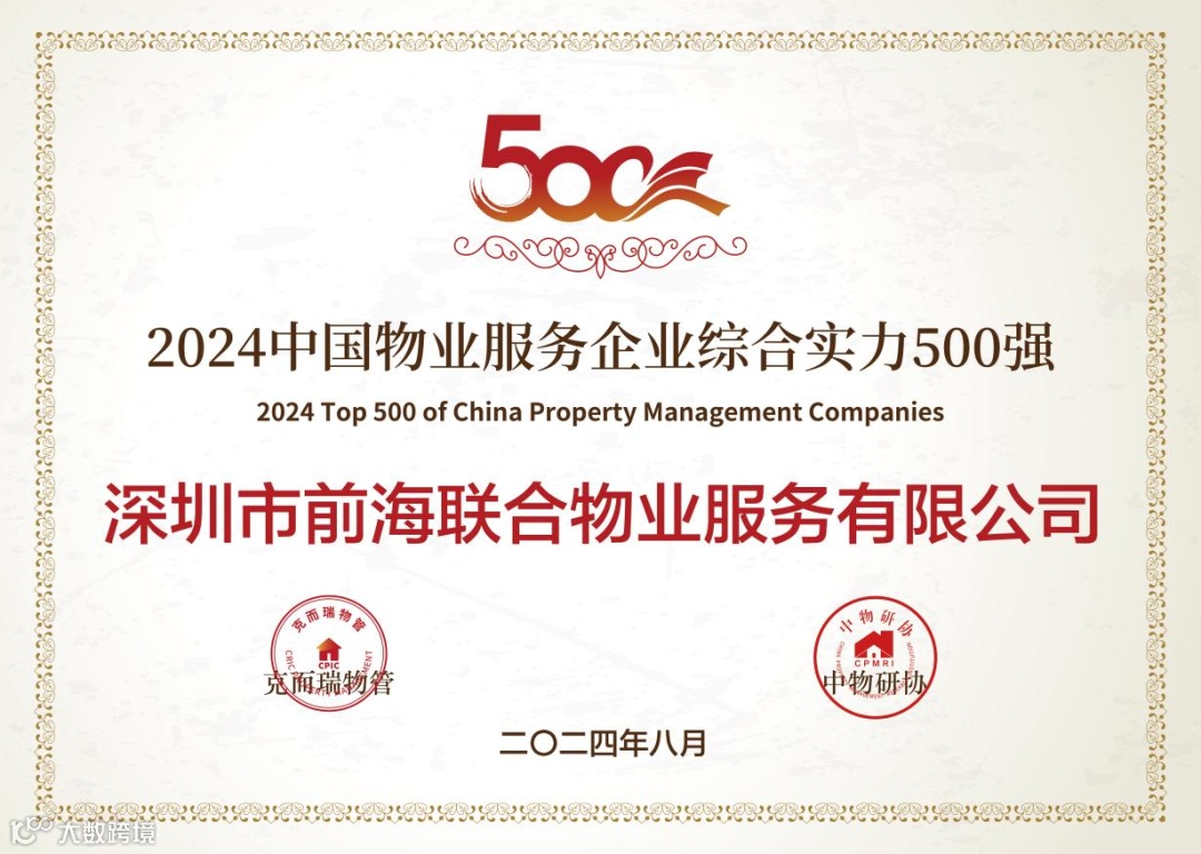 前海联合物业凭借较强的综合实力、出色的管理及服务水平,荣获“2024中国物业服务企业综合实力500强”,此次获奖是行业与市场对前海联合物业服务的高度认可,也进一步彰显了公司品牌的知名度和影响力。