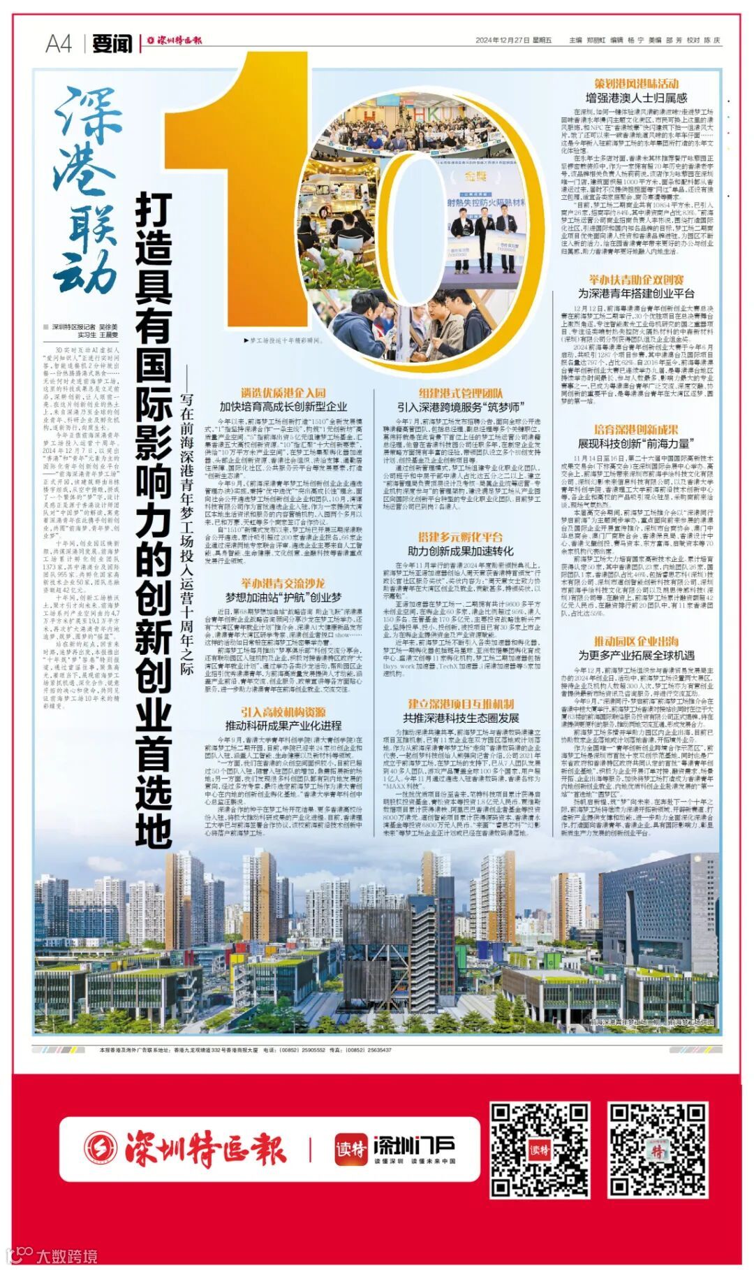 12月27日,深圳特区报发布特别报道《深港联动 打造具有国际影响力的创新创业首选地》,聚焦前海深港青年梦工场作为“深港青年创新创业的摇篮”,在投入运营十周年之际,展现了其从产业园区向国际化创新平台的精彩蝶变。报道详细回顾了梦工场十年来在深港合作、创新创业、人才集聚等方面的丰硕成果,点赞其为港澳青年提供了广阔的追梦、筑梦、圆梦舞台,持续为深港融合发展注入新活力,开辟新空间。