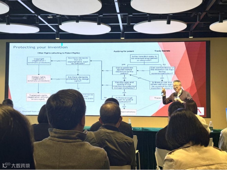 在分享环节,李广文律师为有意出海的企业,讲解要如何搭建国际知识产权保护体系,刘恩国顾问则从国内初创企业实际操作层面提供建议。