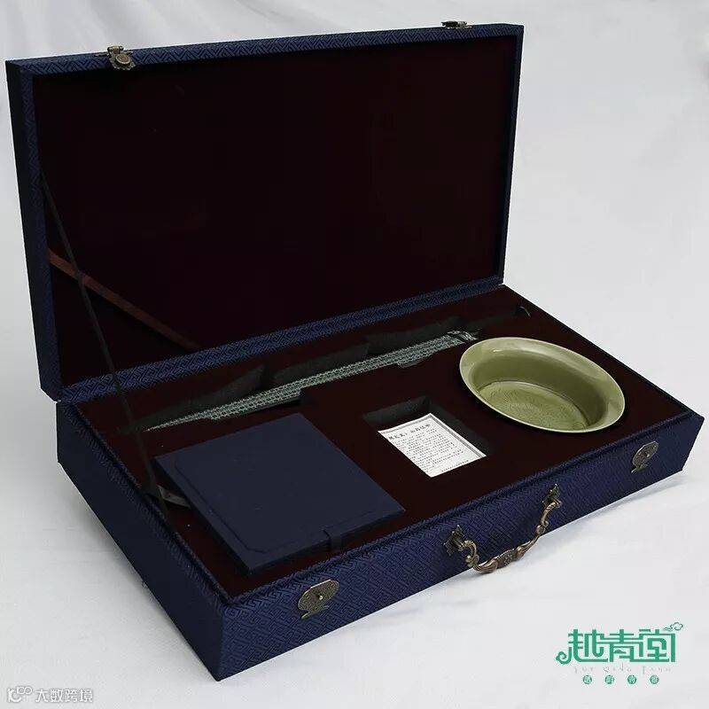 越青堂出品之《古越三宝》,由一越窑青瓷聚宝盆、一越王勾践剑、一越青铜镜组成,分别代表了聚财、镇宅、辟邪的功用。配高端礼盒一个、证书一张、架子两个。