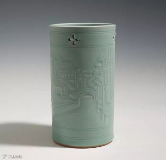 《幸运乌镇》是《印象乌镇》系列之三,通体釉质如玉,晶莹剔透,粉青直筒,器型端庄简洁,可作书画筒、笔筒、花器等。筒面上使用浅浮雕手法,纯手工雕刻,将作者个人多年来最魂牵梦绕的乌镇水街场景雕刻于上,马头墙、小桥流水、长街深巷……无不散发着浓浓的江南水乡韵味,足见匠心独具。