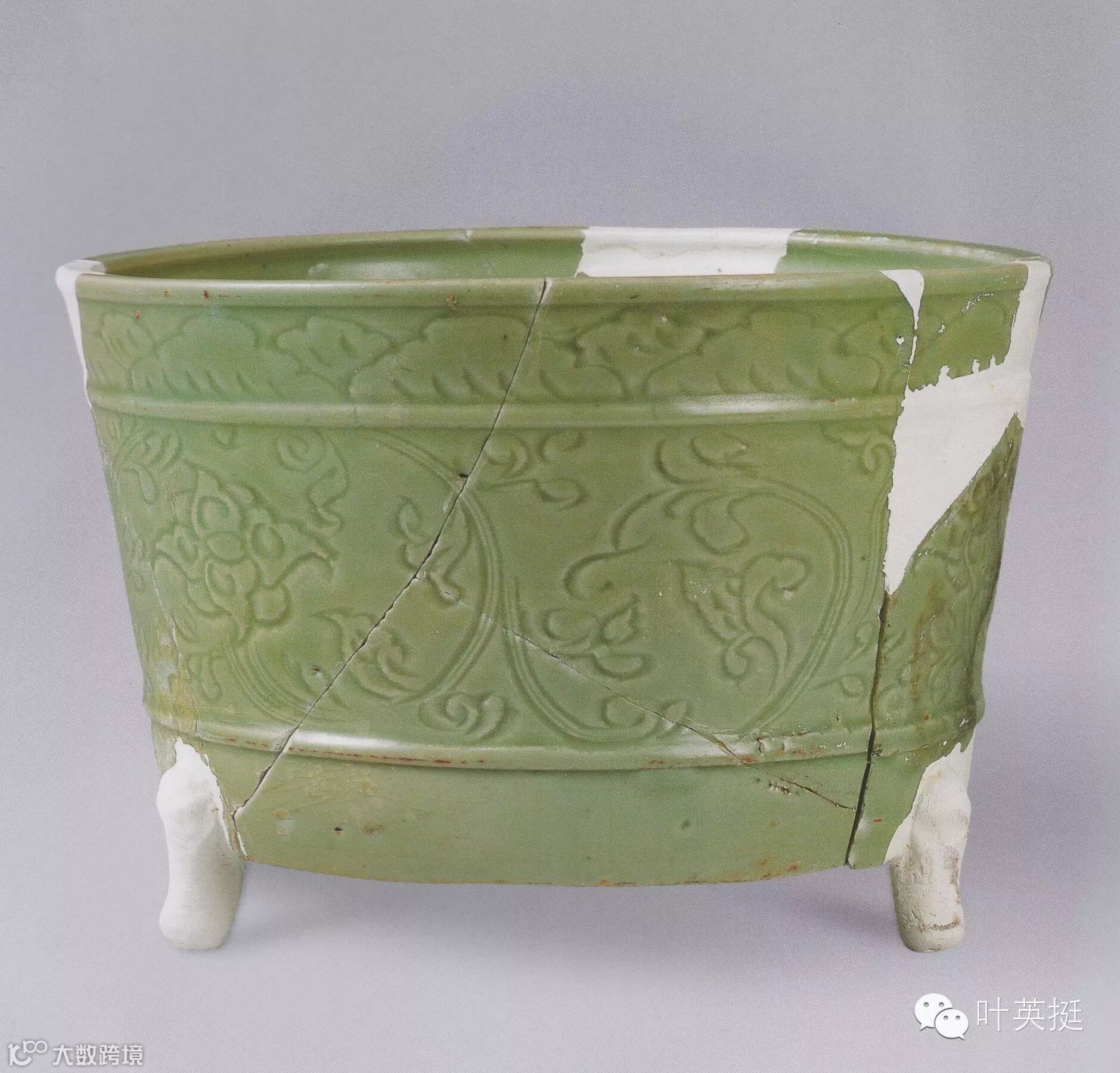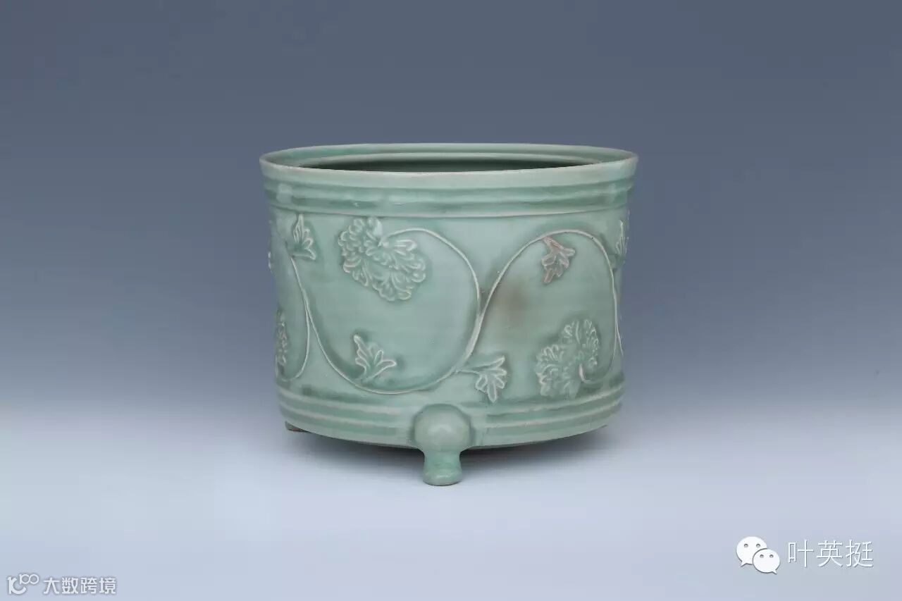 此炉既保留了早期奁式炉的一些特征,又受到宋元龙泉窑流行贴饰缠枝牡丹纹的影响,在装饰等距离的三道弦纹之外,贴饰缠枝牡丹纹,花瓣的繁复与单茎线条的简洁形成和谐的统一,既典雅大方,又活泼生趣。