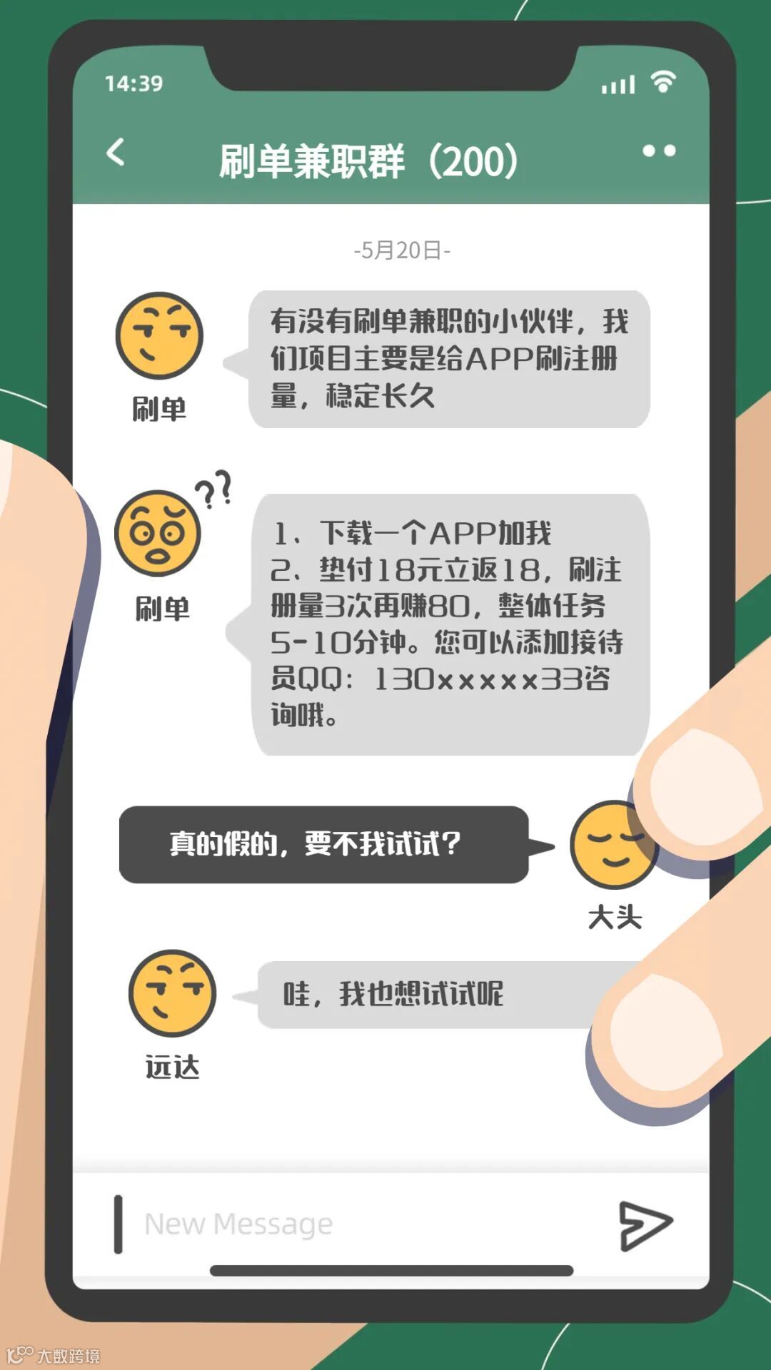 骗子通过短信或者群聊等方式发布“刷单兼职”信息,声称动动手指足不出户便可日赚百元,先以小额任务为诱饵,获取你的信任。再以“联单”“系统出错导致冻结”等原因不返现,要求你充值更多钱或缴纳“保证金”。