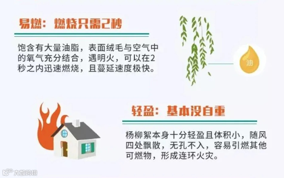 在飞絮漫舞的季节,一定要提高警惕加强防范。杨柳絮一旦起火,蔓延速度极快,绝对不能通过点燃的方式清理杨柳絮。点燃杨柳絮引发火灾,是要被追究相应法律责任的!