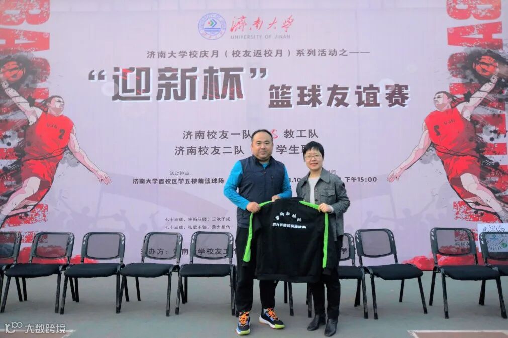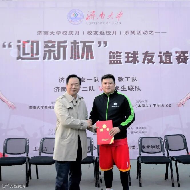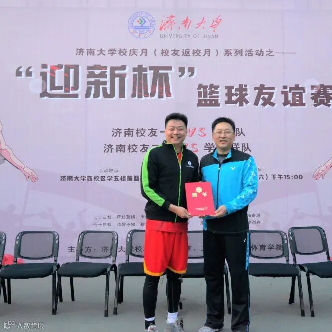 活动开始之前,济南大学校友工作办公室为济南校友篮球队主教练辛雨、赞助方国筑体育集团董事长王志军颁发了名誉校友证书;山东雷纳新材料工程有限公司为济南校友篮球队冠名,向全体球员赠送队服。