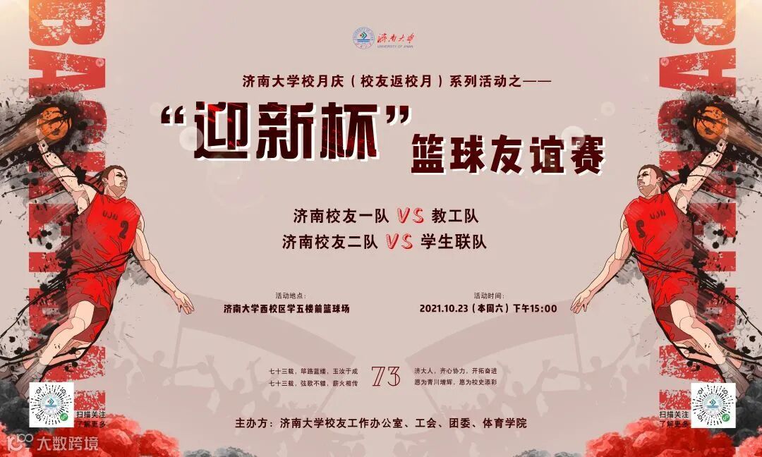 10月23日,由济南大学校友工作办公室、工会、团委、体育学院主办的建校73周年校庆月系列活动——“迎新杯”校友篮球友谊赛在主校区篮球场举行。刘宗明副校长,济南大学校友会副会长张伟、彭震,国筑体育集团董事长王志军,98级校友、山东雷纳新材料工程有限公司总经理张笛,学校相关部门、学院负责同志,以及近五十名济南校友参加活动。