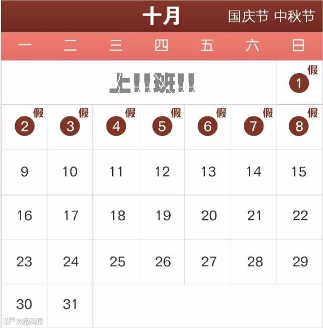 9月30日(星期六)上班,整个10月只用上17天班。