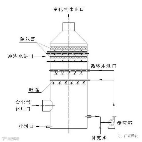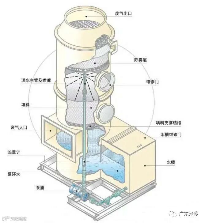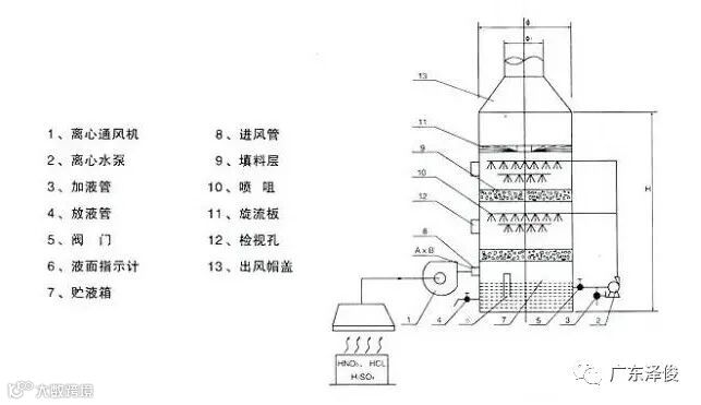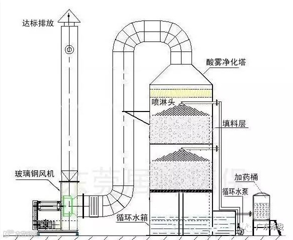 酸雾废气由风管引入净化塔,经过填料层,废气与氢氧化钠吸收液进行气液两相充分接触吸收中和反应,酸雾废气经过净化后,再经除雾板脱水除雾后由风机排入大气。吸收液在塔底经水泵增压后在塔顶喷淋而下,最后回流至塔底循环使用。净化后的酸雾废气达到广东省地方排放标准的排放要求,低于国家排放标准。