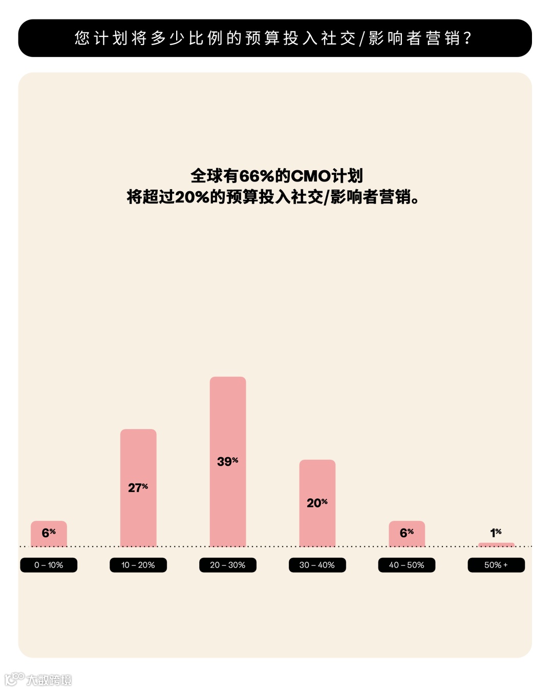 全球CMO在影响者营销上的投入差异很大:有39%的受访者计划把20%–30%的营销预算投向社交/影响者渠道,另有27%打算投入超过30%。