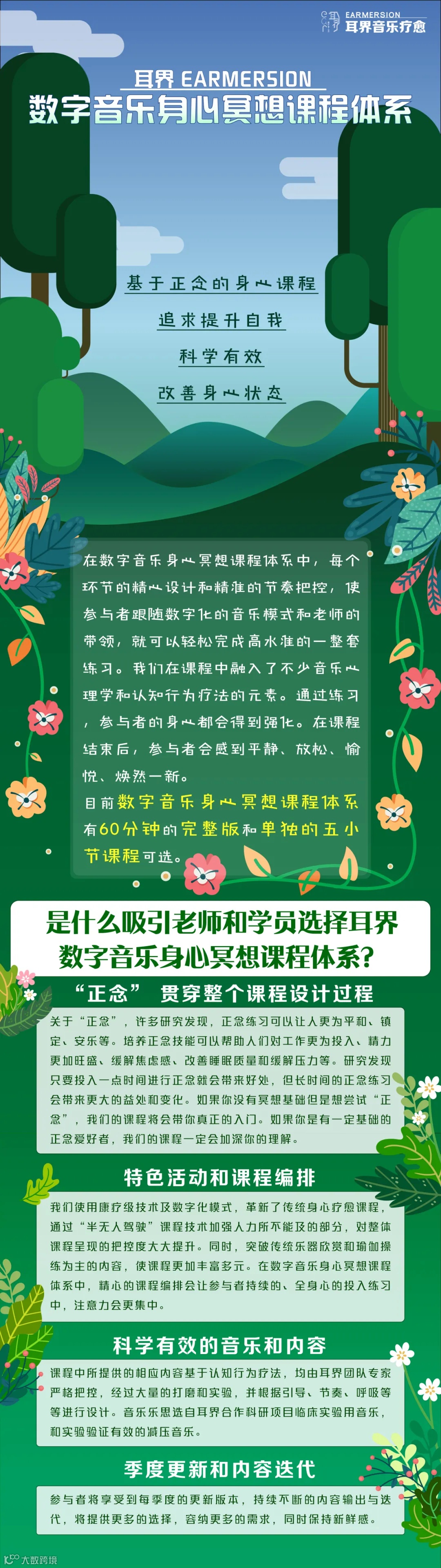 耳界数字音乐身心冥想课程是一项基于正念的身心课程,适合所有对提升自我有追求的人,能科学有效的帮助改善身心状态。