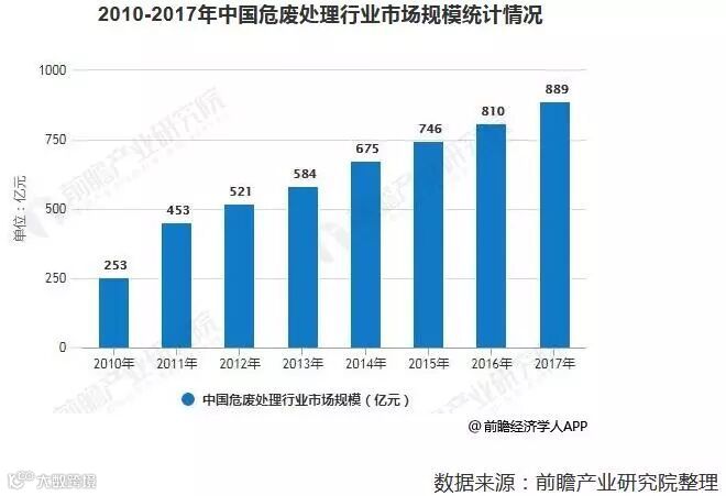 我国危废处理行业自2001年左右起步,经过十多年的发展,行业进入快速增长阶段,但也存在经验和技术上的短板。由于我国危废整体处置率较低,使得行业市场规模较小。据前瞻产业研究院发布的《中国危废处理行业市场前瞻与投资战略规划分析报告》统计数据显示,2010年中国危废处理行业市场规模仅仅为253亿元,2011年中国危废处理行业市场规模增长至453亿元。之后一直保持平稳增长,到了2016年中国危废处理行业市场规模突破800亿元,截止到2017年中国危废处理行业市场规模达到了约889亿元。