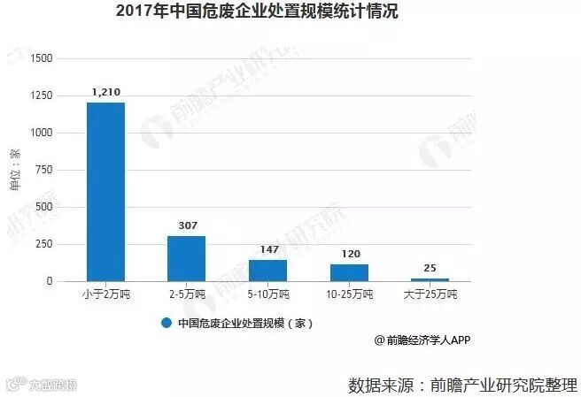 正因此,我国危废处理行业参与者较多,但企业规模普遍较小。根据2017年7月的数据统计,我国危废处理企业产能低于2万吨、2-5万吨、5-10万吨、10-25万吨和25万吨以上的企业数量分别为1210家、307家、147家、120家和25家,67%的企业危废处理产能低于2万吨。
