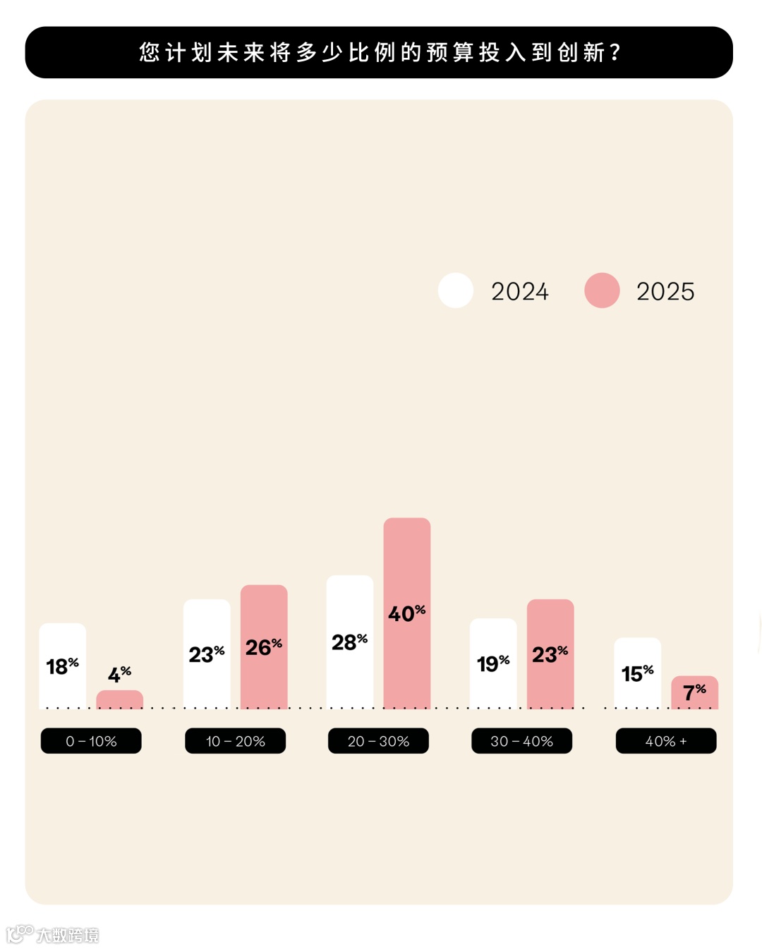 90%的CMO明确表示,他们希望创新能直指企业最紧迫的业务挑战,而非停留为边缘性的试验项目。相应地,投入也在增加:计划在2025年将超过20%预算投入创新的CMO比例升至70%,较2024年的59%显著上升。